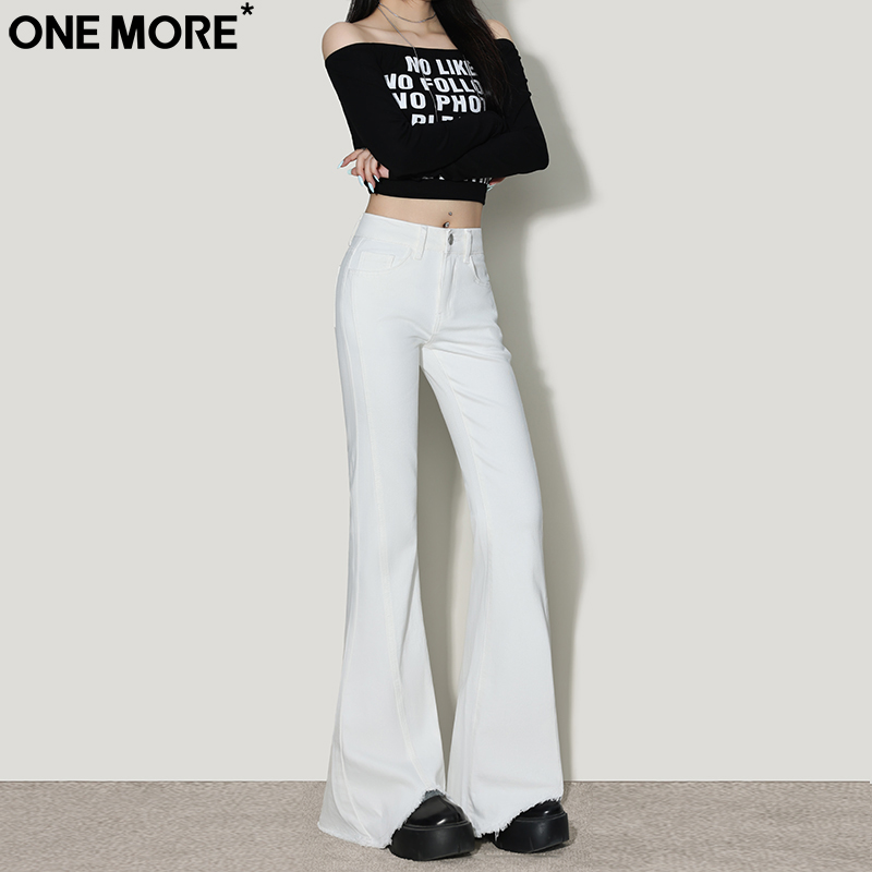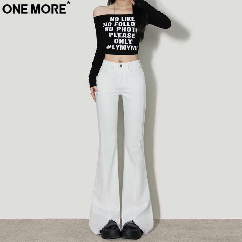 More美式 弹力紧身显瘦喇叭裤 毛边白色微喇牛仔裤 新款 女秋冬季 One