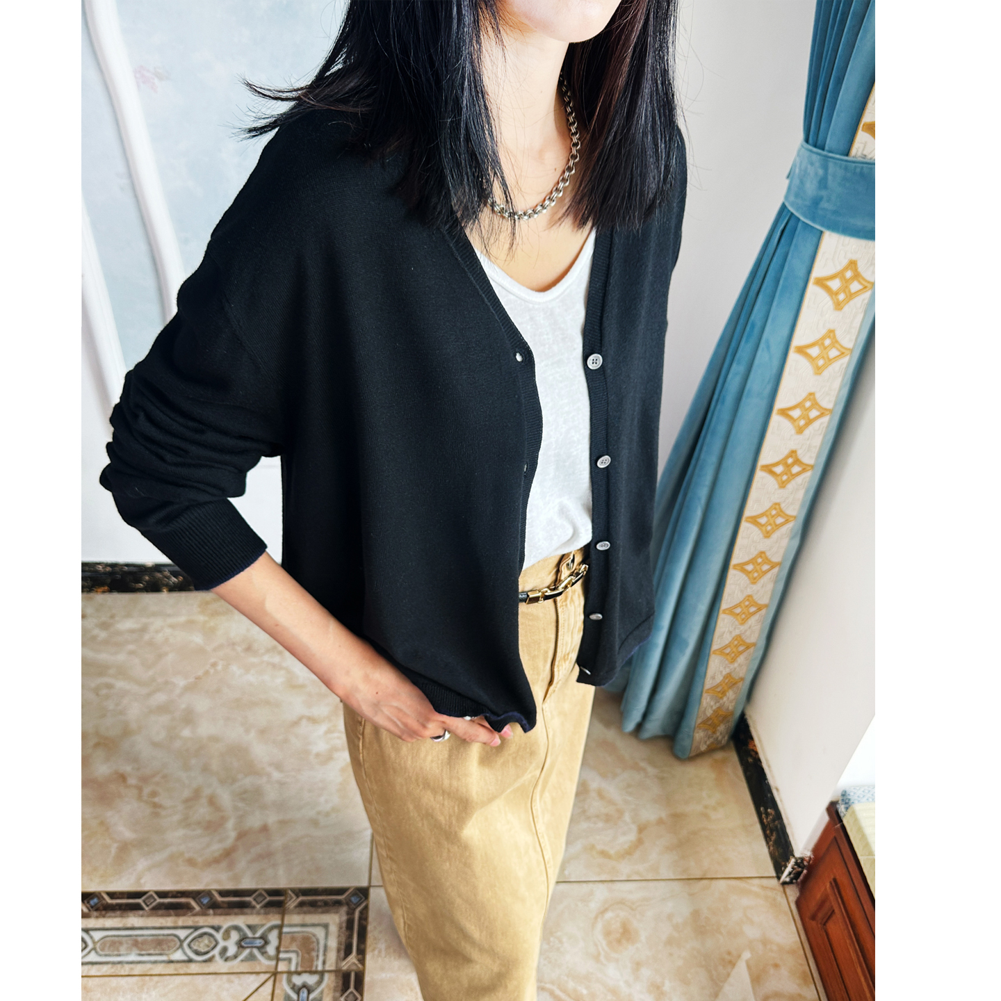 女针织开衫 此时@不曾 美丽诺羊毛混纺V领毛衫 柔软不扎肉 撞色边