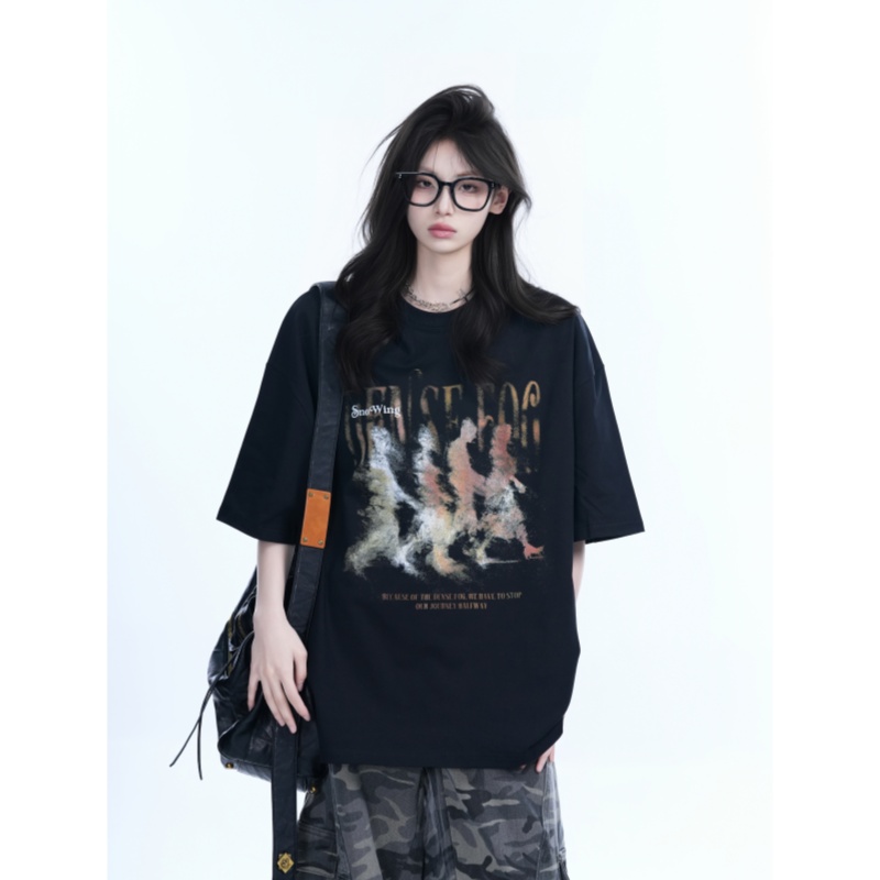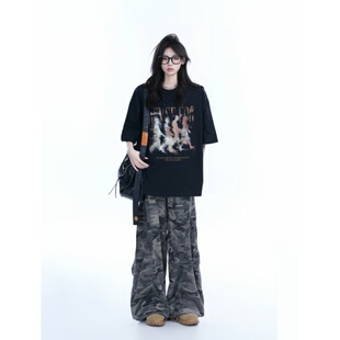 重磅宽松圆领半袖 美式 夏季 t恤女2025新款 上衣潮 复古人物黑色短袖
