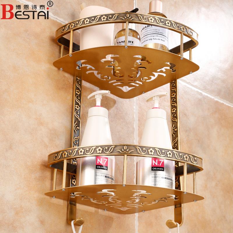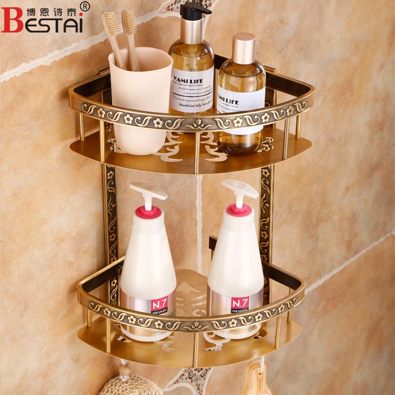免打孔仿古浴室三角篮墙角卫生间壁挂欧式 太空铝双层转角置物架子