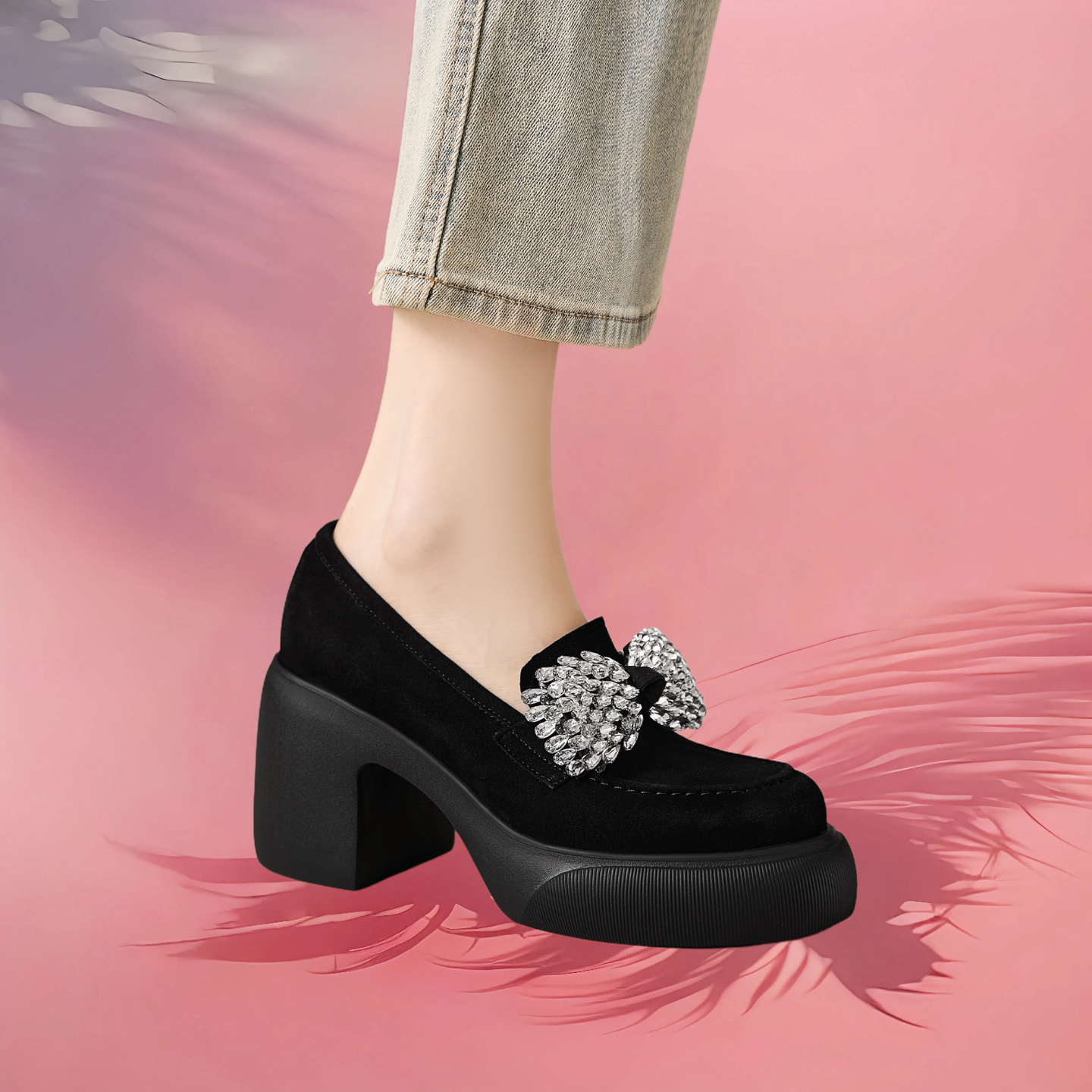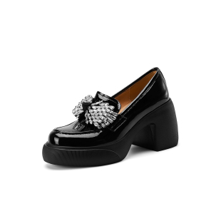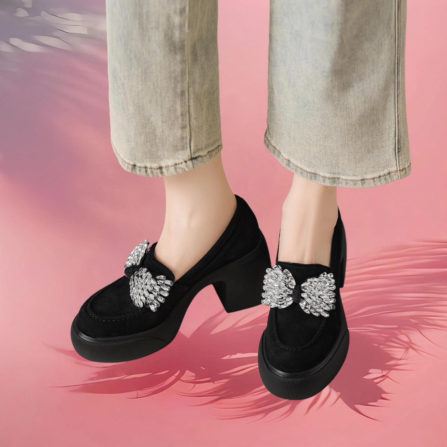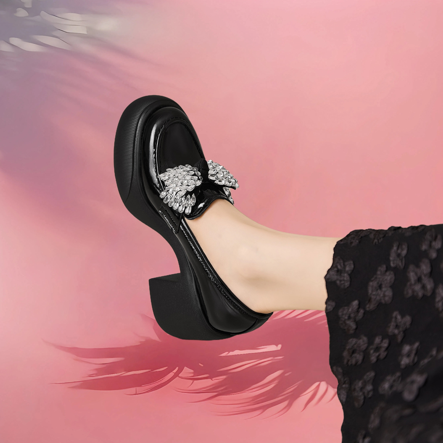 女软底小皮鞋 秋季 真皮圆头粗跟单鞋 2025新款 水钻蝴蝶结厚底乐福鞋