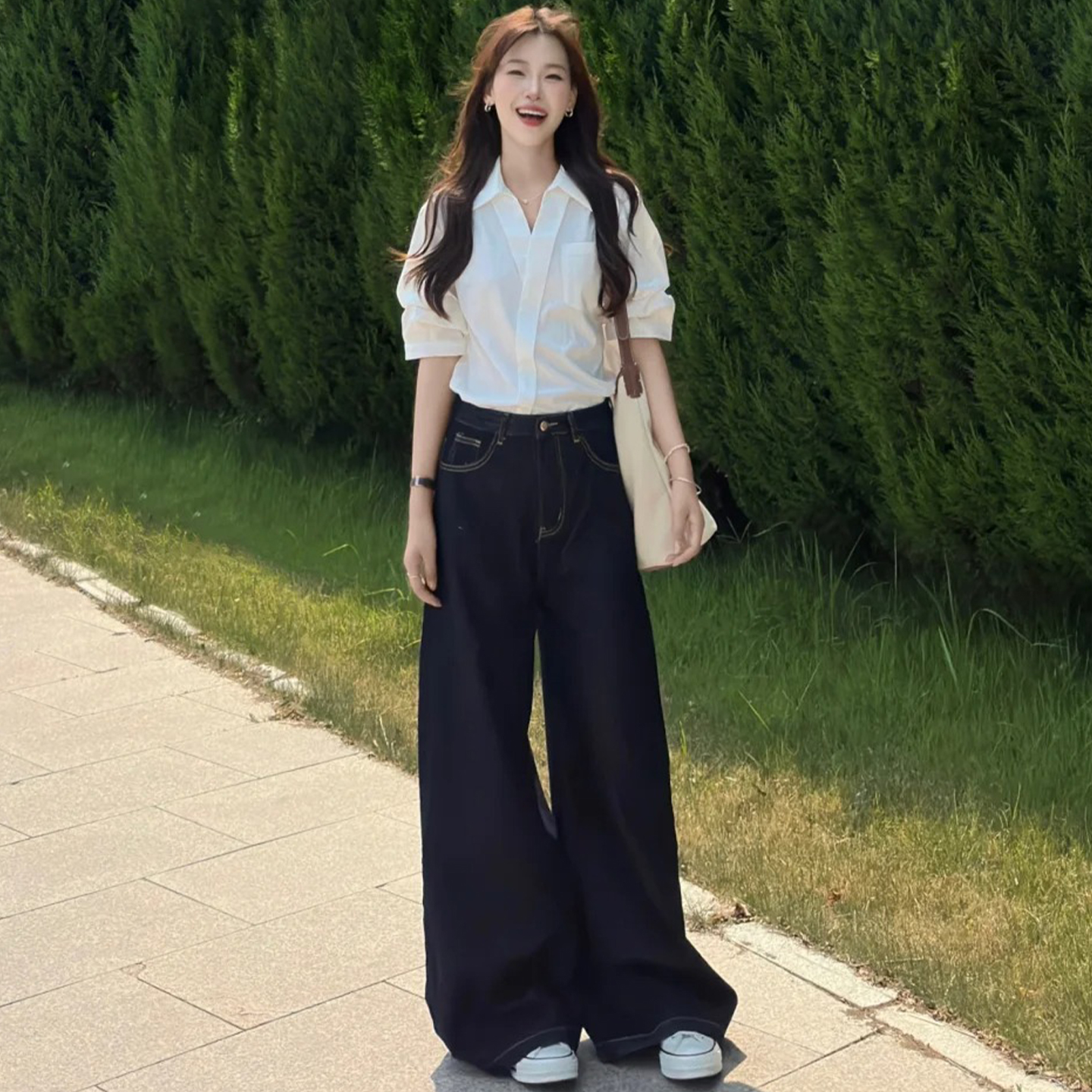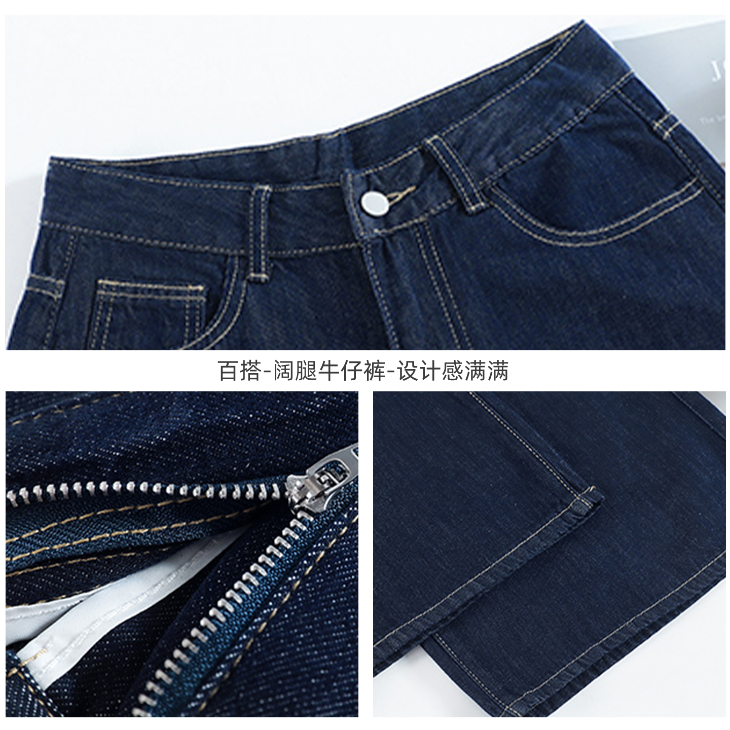 高腰显瘦慵懒直筒休闲裤 女秋2025年新款 深蓝色宽松阔腿牛仔裤 美式