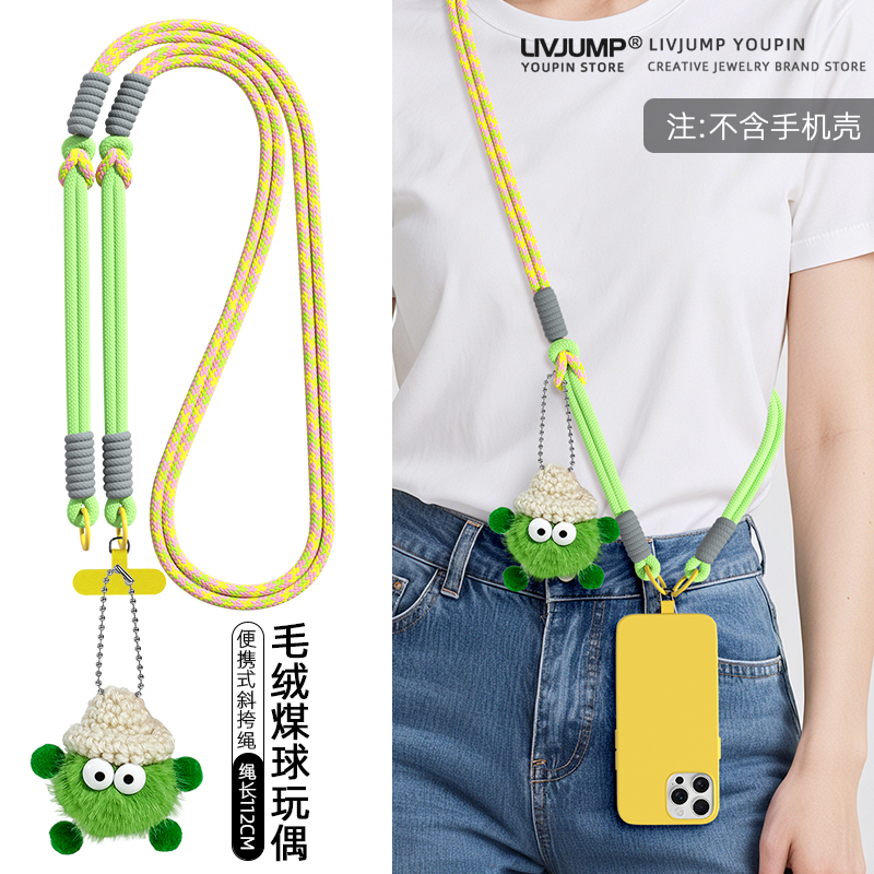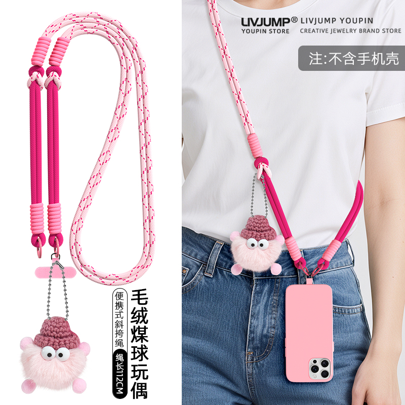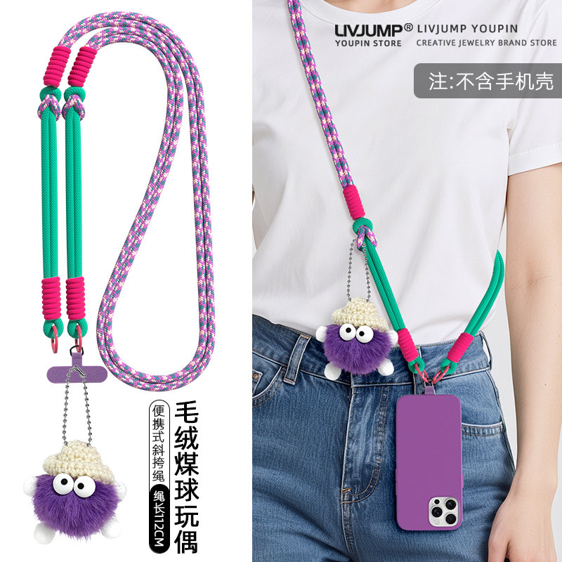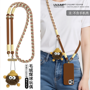 网红小煤球貂毛可爱公仔手机挂绳长款 斜挎可肩背带撞色编织绳小众