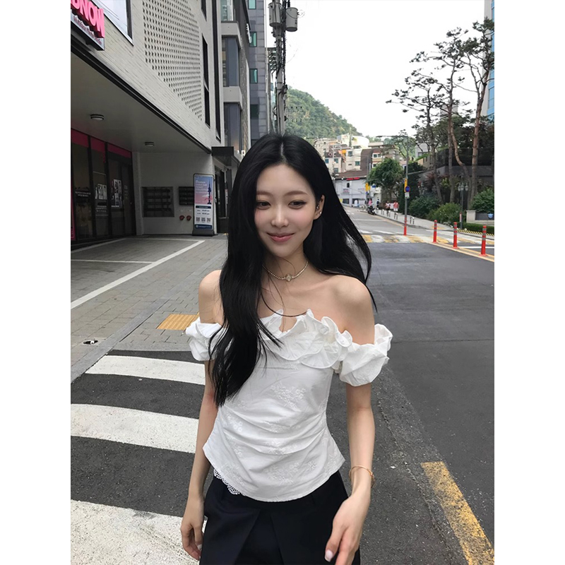 超好看 t恤女夏季 绝美荷叶边露肩小上衣 卷边一字领斜肩短袖 法式