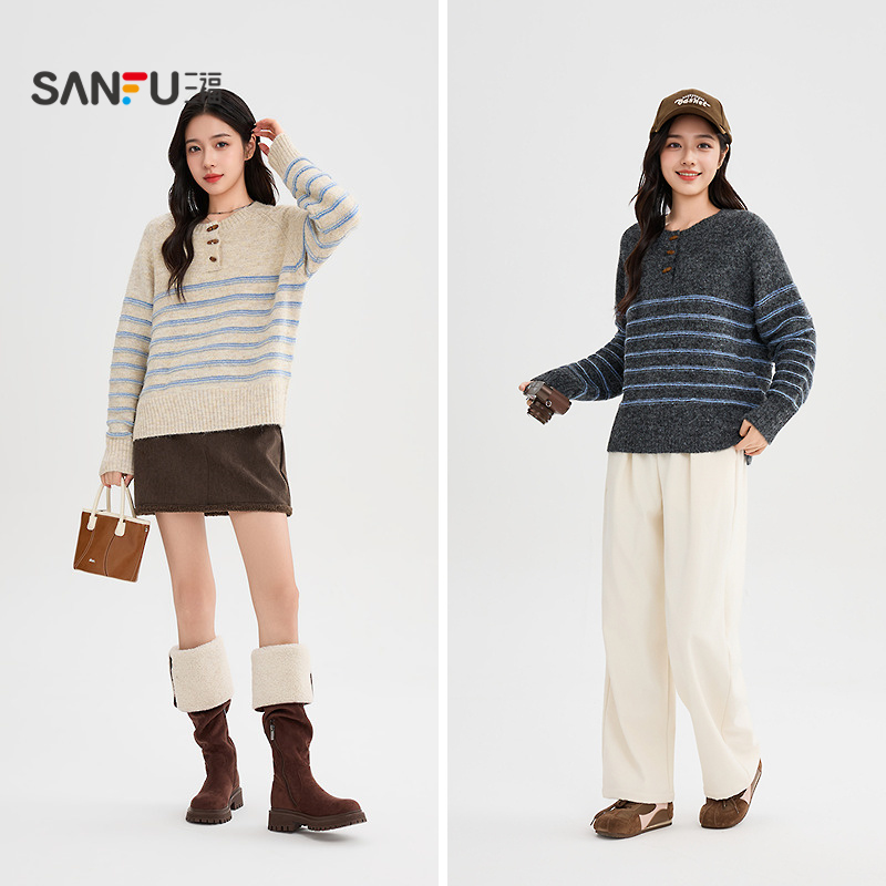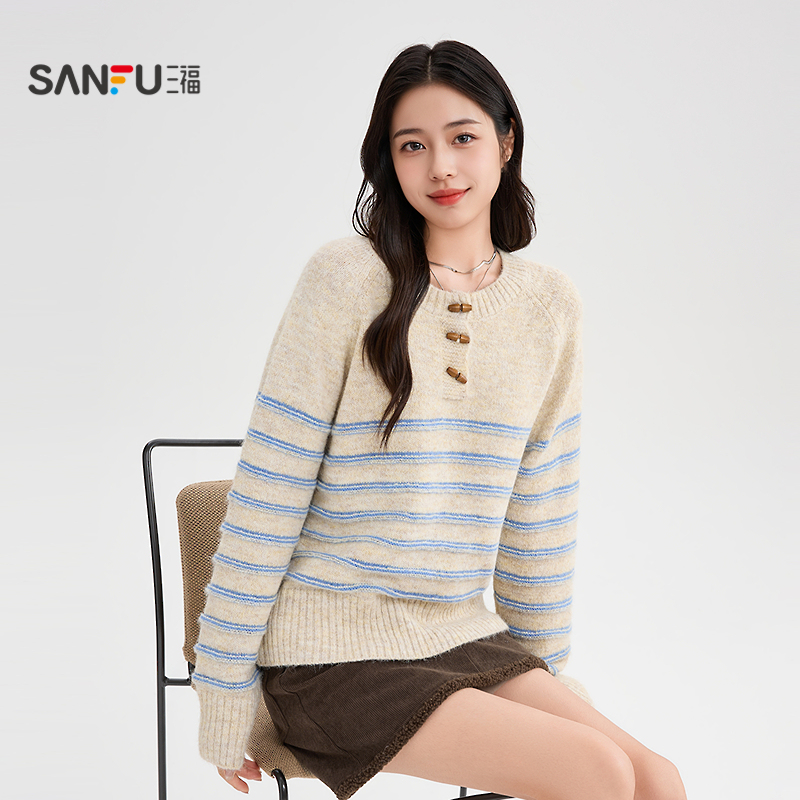 三福毛衣慵懒高级感2025冬季 韩系穿搭半开领撞色条纹宽松上衣女装