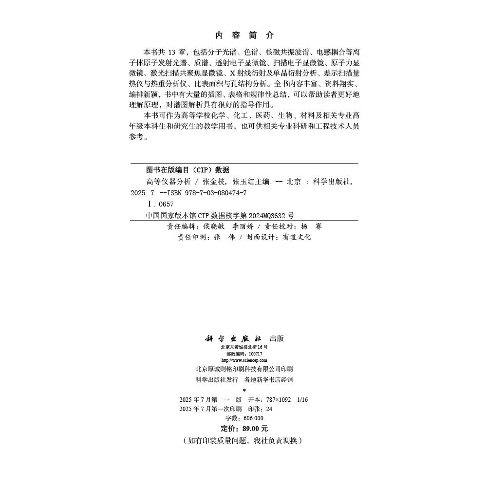 包括分子光谱 核磁共振波谱电感耦合等离子等 张金枝 科学出版 社 主编 高等仪器分析 张玉红 色谱 本书共13章 现货正版