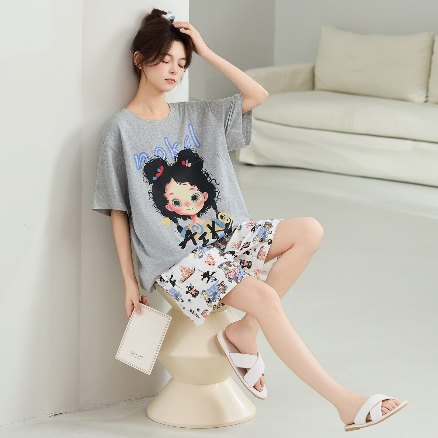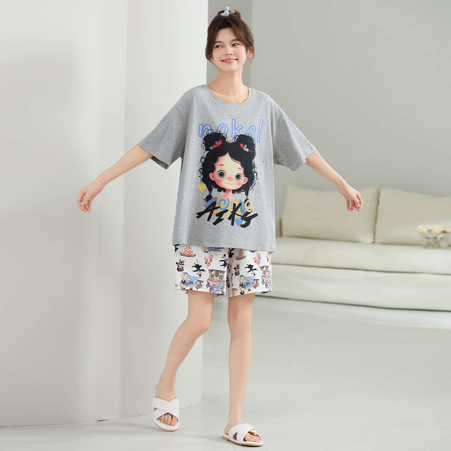 宽松卡通外穿防螨家居服套装 纯棉睡衣女短袖 潮酷 夏季 都市丽人新款