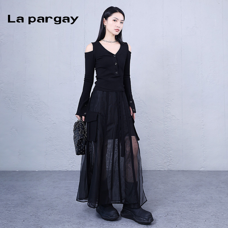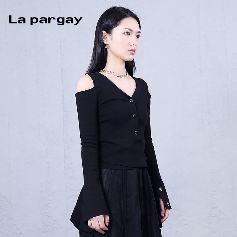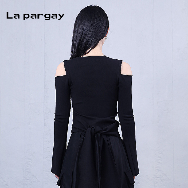 新款 2025春季 女士黑色个性 修身 上衣 纳帕佳露肩绑带短款 长袖 针织衫