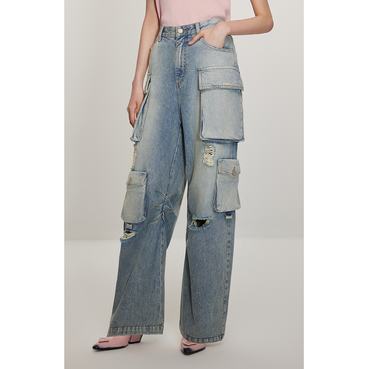 女破洞直筒宽松显瘦流行早秋新品 OCHIRLY欧时力 阔腿牛仔裤 裤 工装