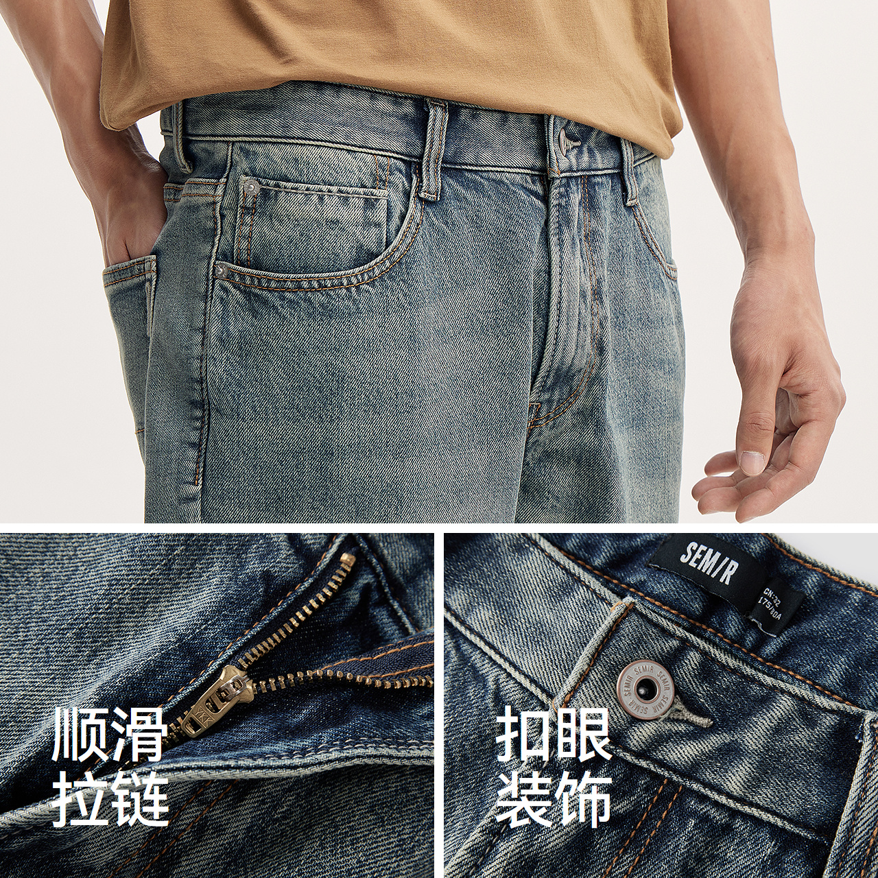 森马牛仔裤 长裤 男复古做旧直筒裤 新款 弹力抓绒 2025冬季 森柔牛仔
