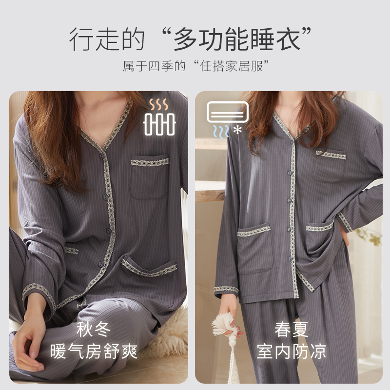 套装 睡衣女春秋季 高级感小香风家居服大码 长袖 秋天莫代尔绵绸薄款