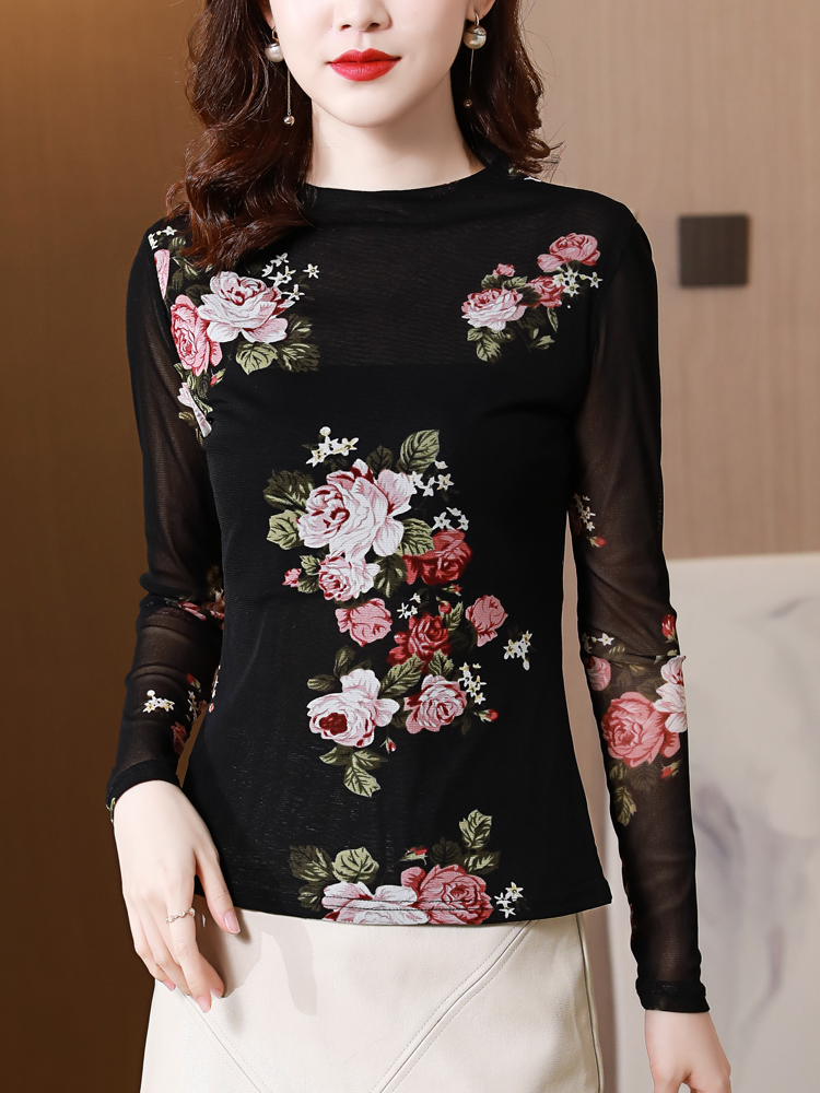 2022年春装 半高领花色打底衫 新款 上衣大码 洋气修身 网纱T恤女长袖