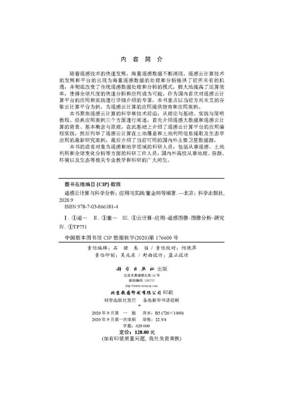 编著 社 董金玮 闫 凯 曾也鲁 遥感云计算与科学分析——应用与实践 李世卫 科学出版 现货 付东杰 包邮