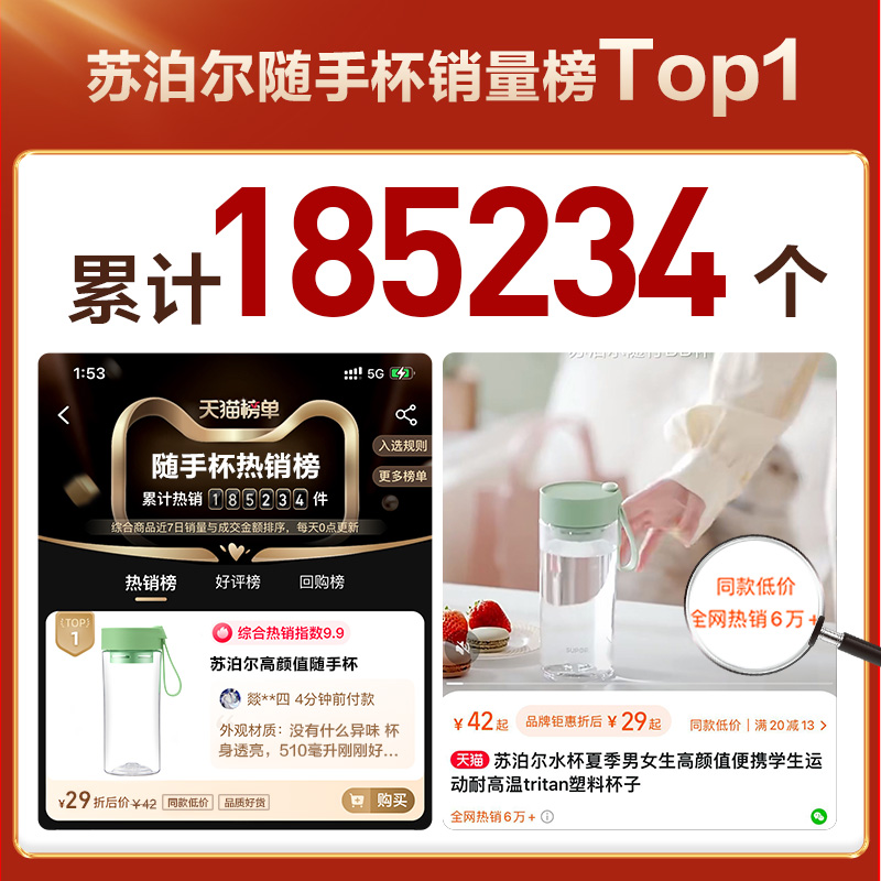 苏泊尔水杯男女学生运动简约便携耐高温塑料杯子防摔手提大容量杯