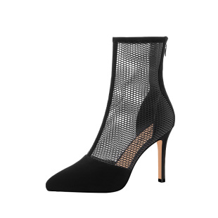 细跟高跟鞋 尖头凉靴女黑色气质2025春秋新款 镂空网靴网纱真皮女鞋