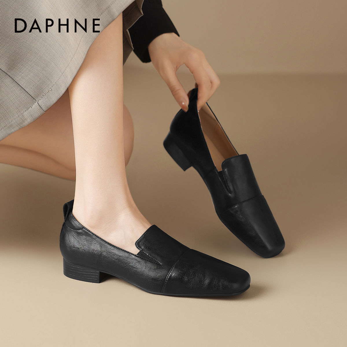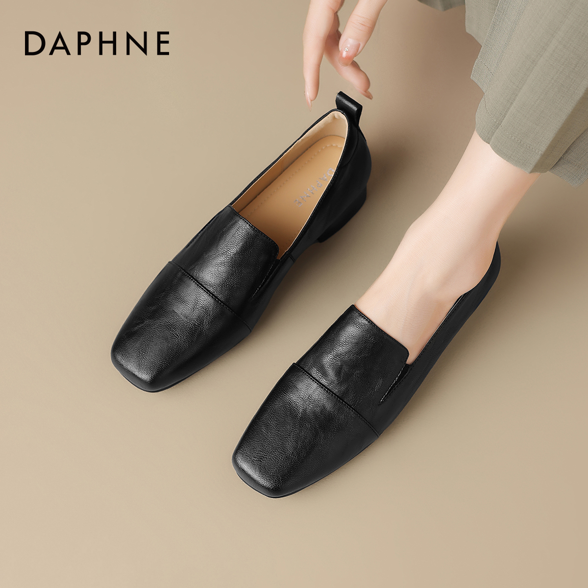 一脚蹬舒适通勤皮鞋 达芙妮黑色乐福鞋 平底方头单鞋 2025新款 女秋季