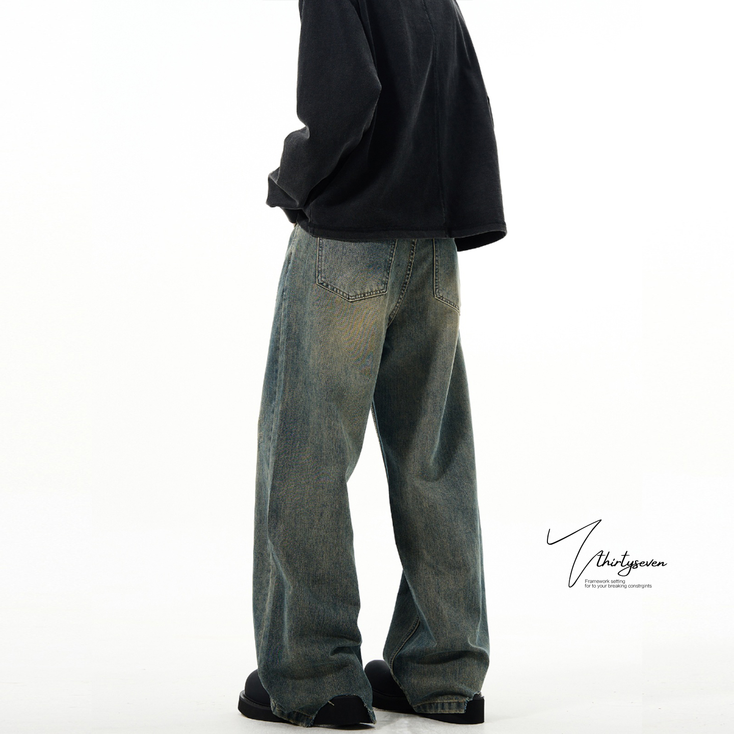 子高街潮牌阔腿长裤 美式 水洗做旧直筒裤 男秋季 复古cleanfit牛仔裤
