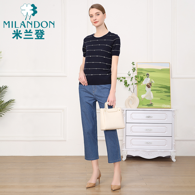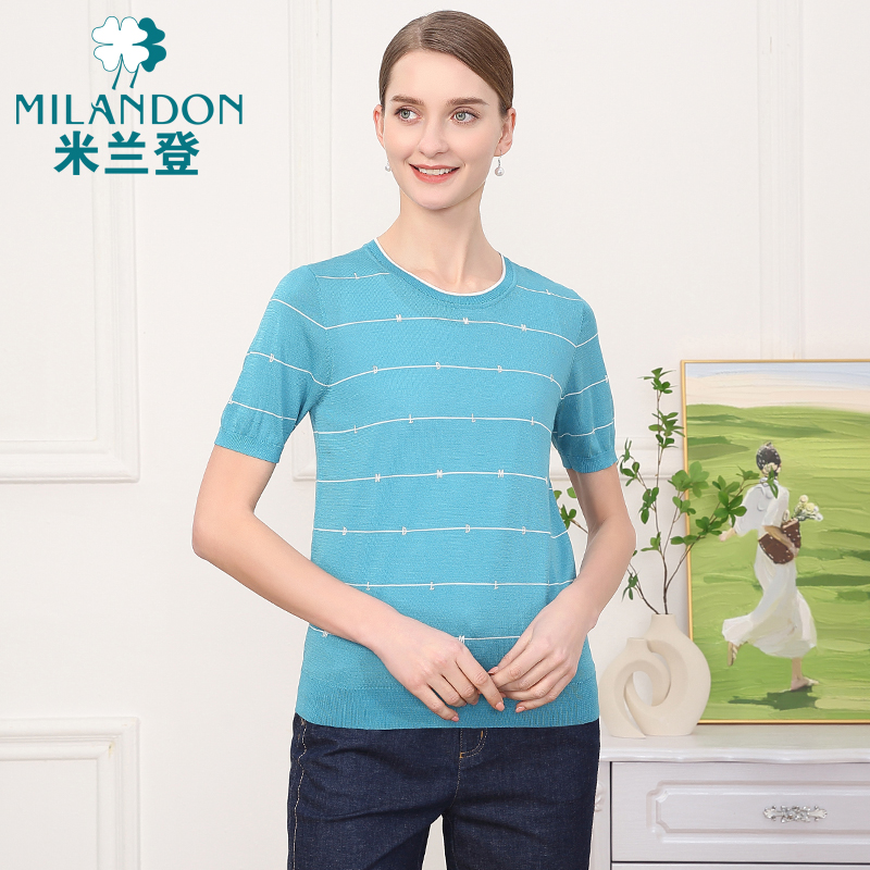 时尚 新款 条纹圆领针织衫 女短袖 上衣薄 米兰登中老年妈妈装 毛衫 夏季