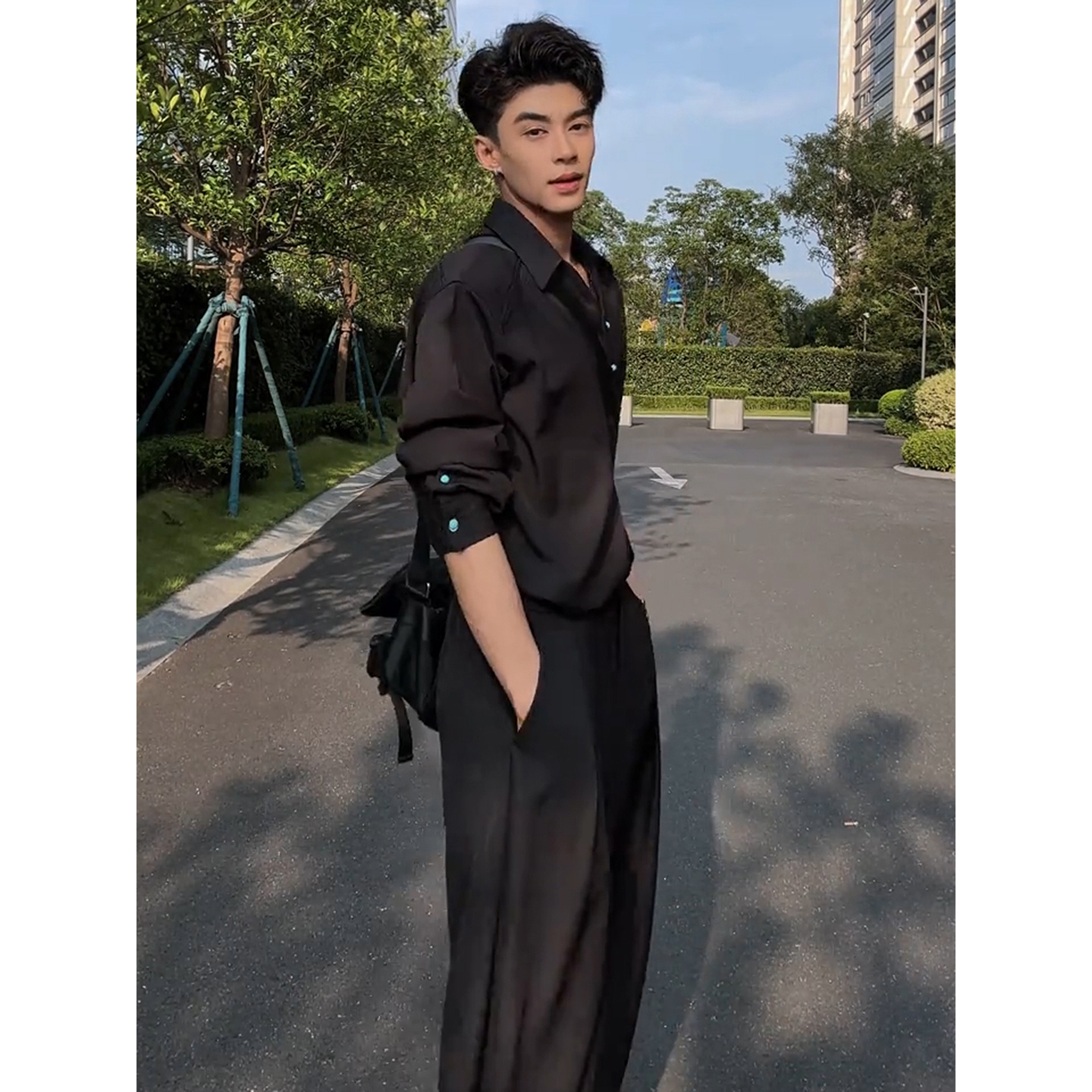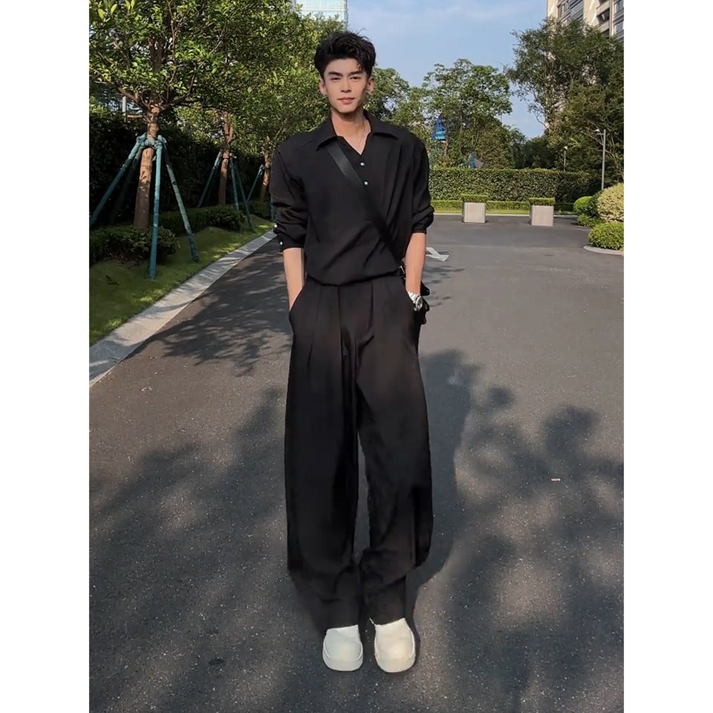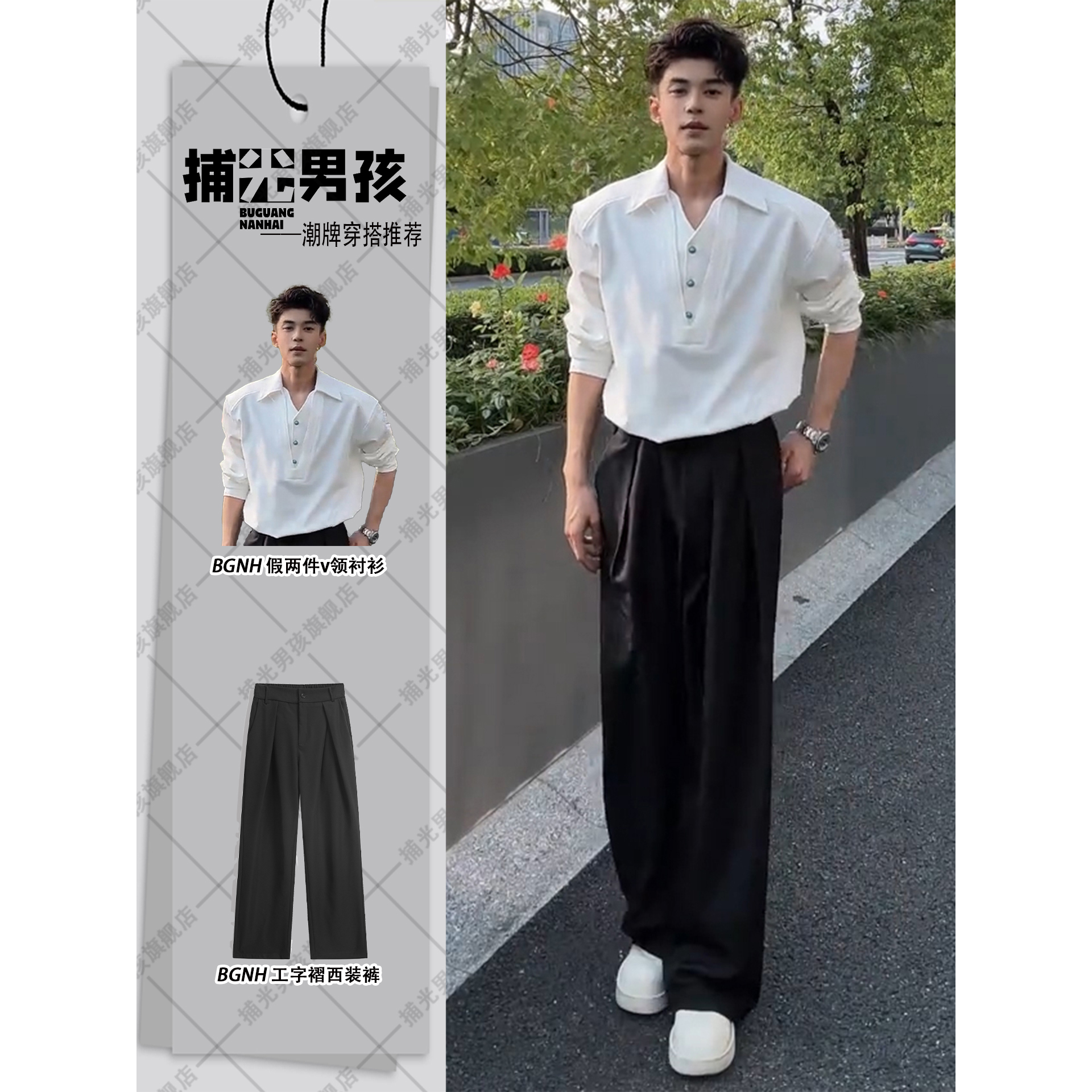 男酷帅穿搭一整套搭配工字褶阔腿西裤 英伦雅痞假两件V领长袖 衬衫