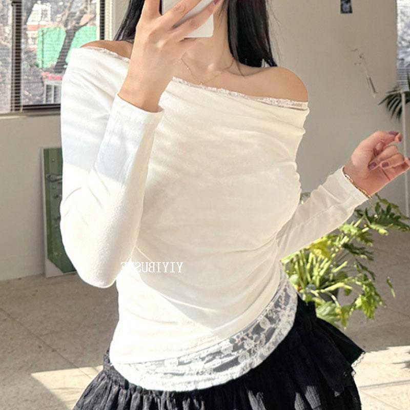 OnoevLH702优雅女人味 T恤bc 性感显身材露肩蕾丝边长袖