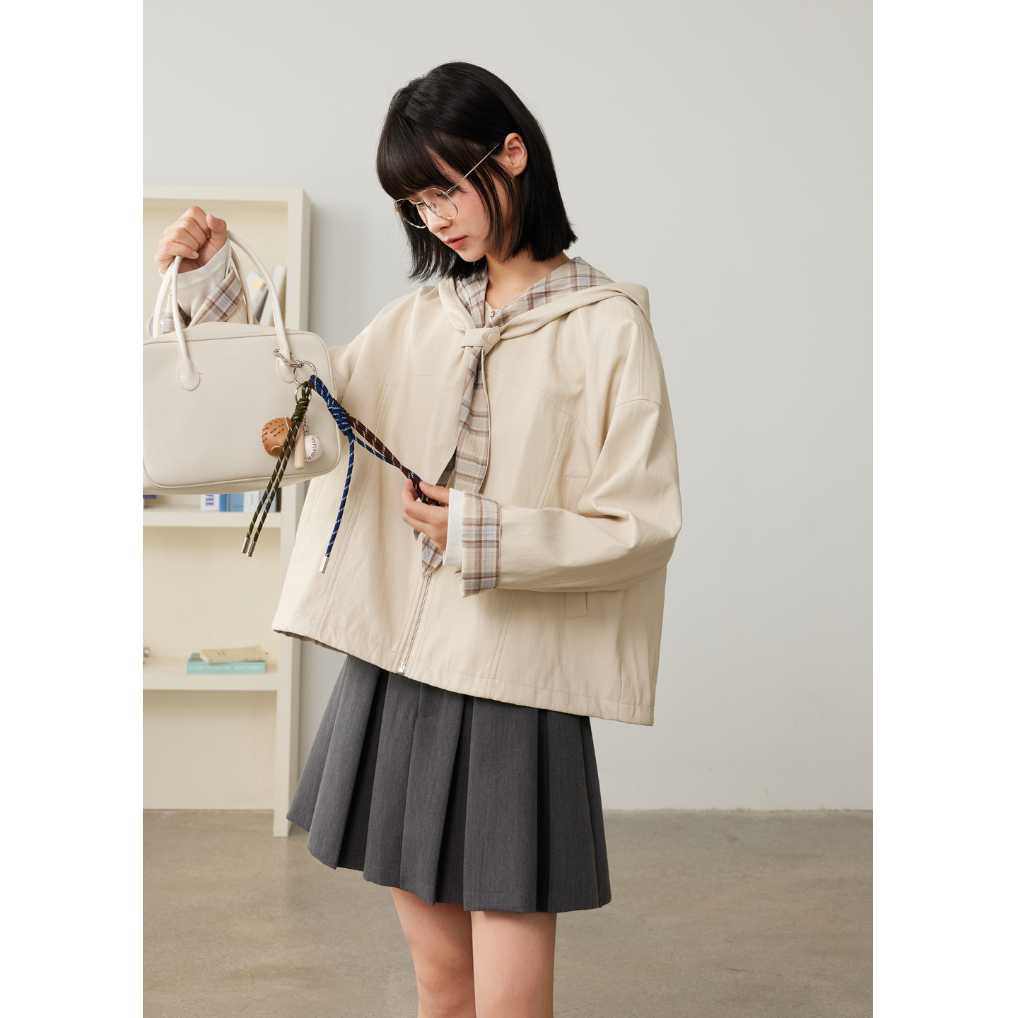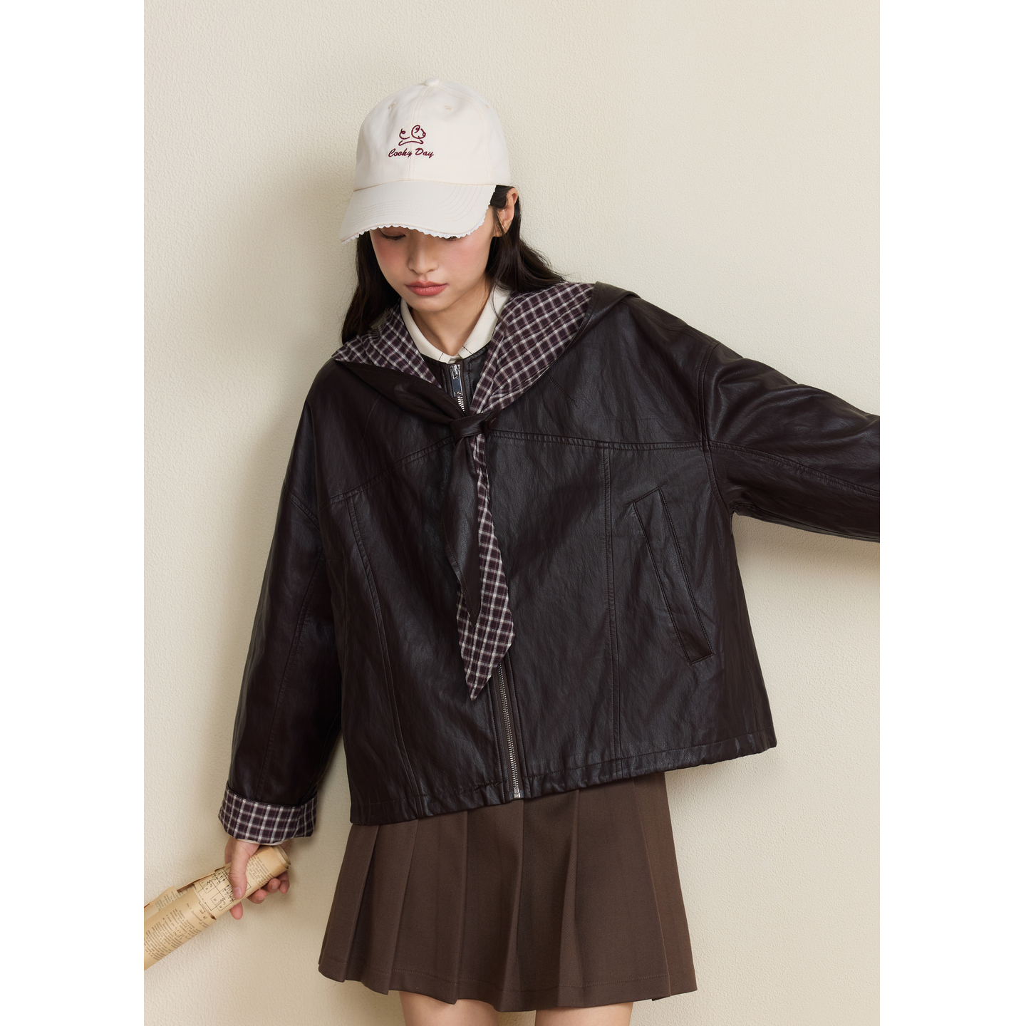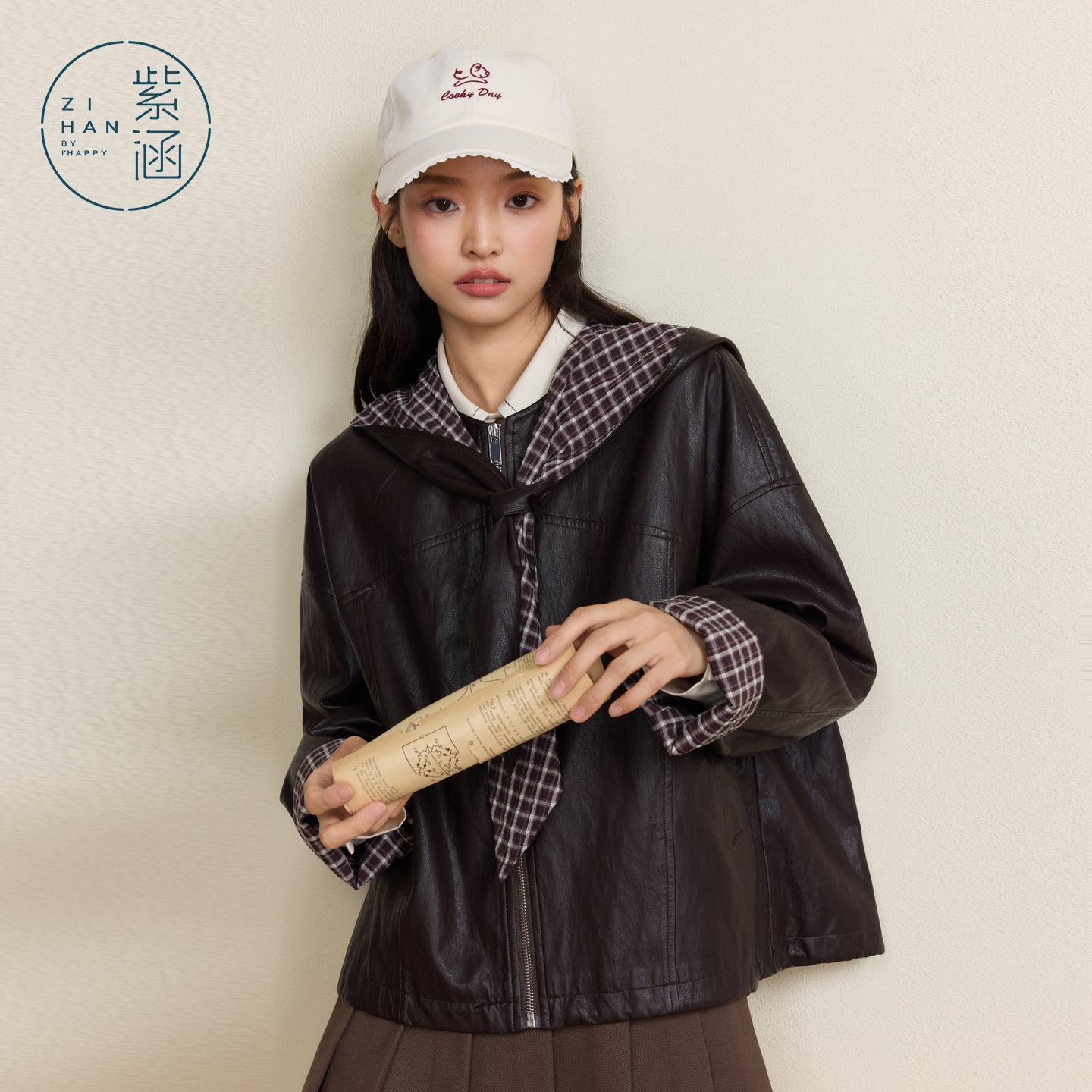 紫涵撞色格纹连帽皮衣女2025年秋季 复古宽松休闲领巾夹克外套 新款