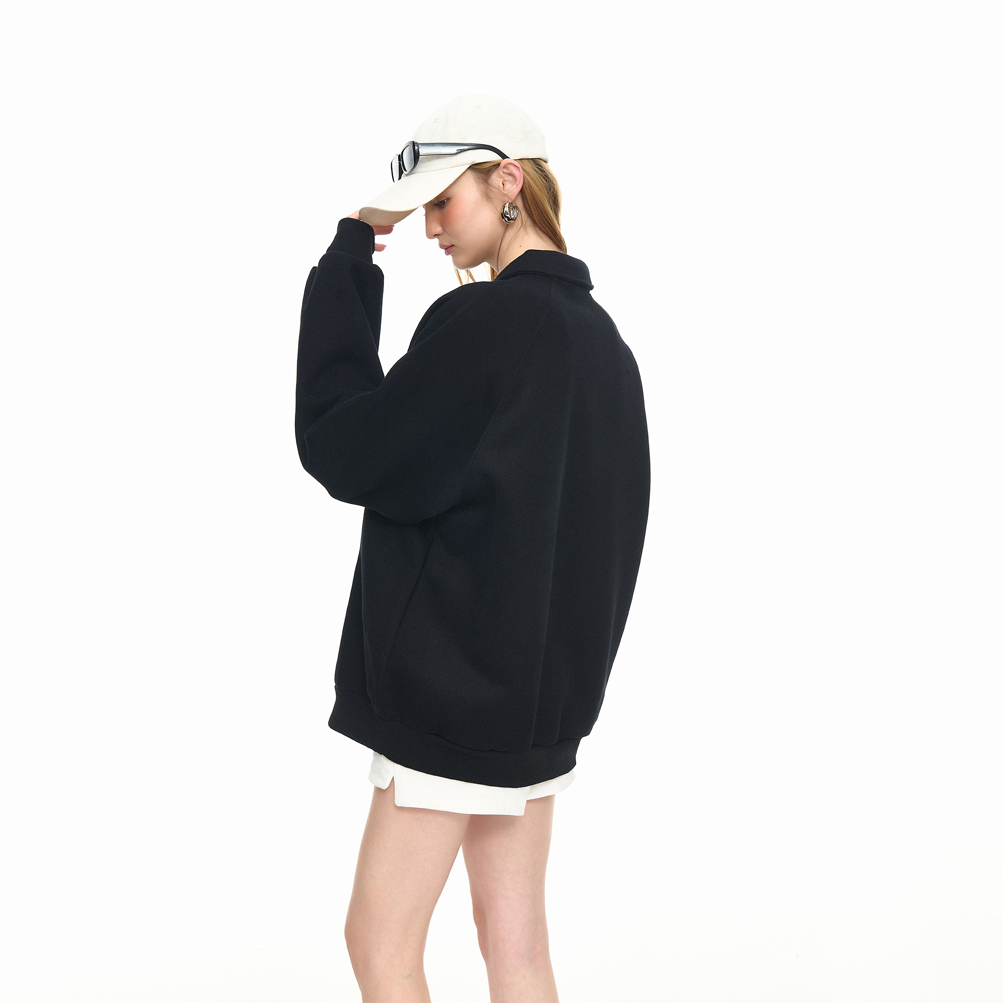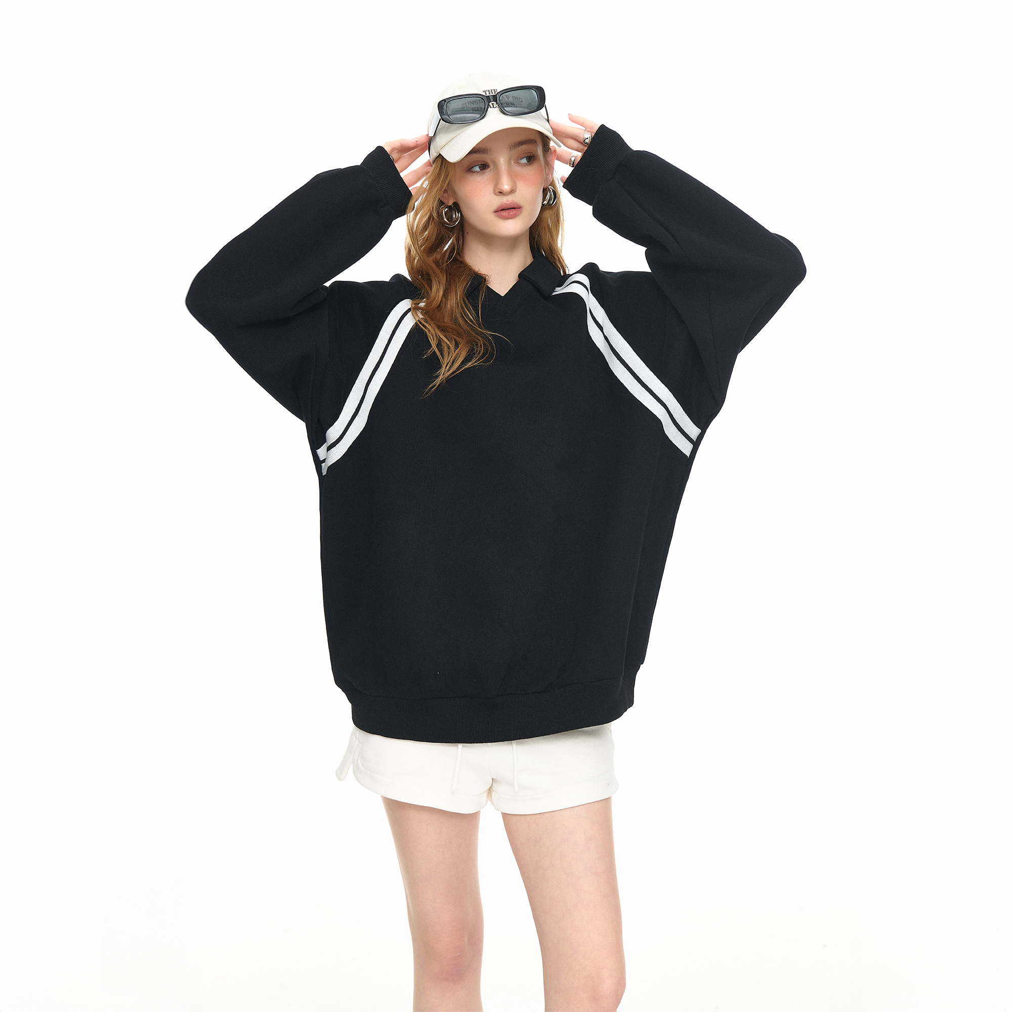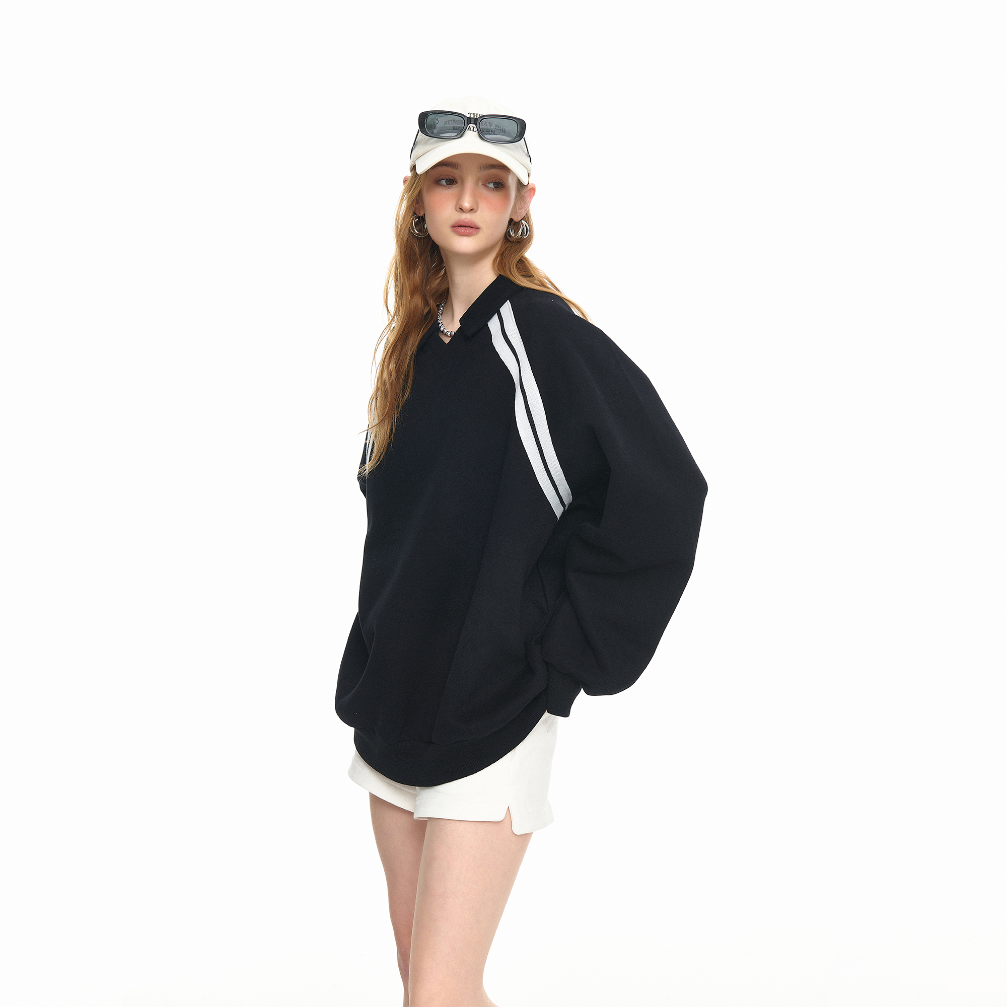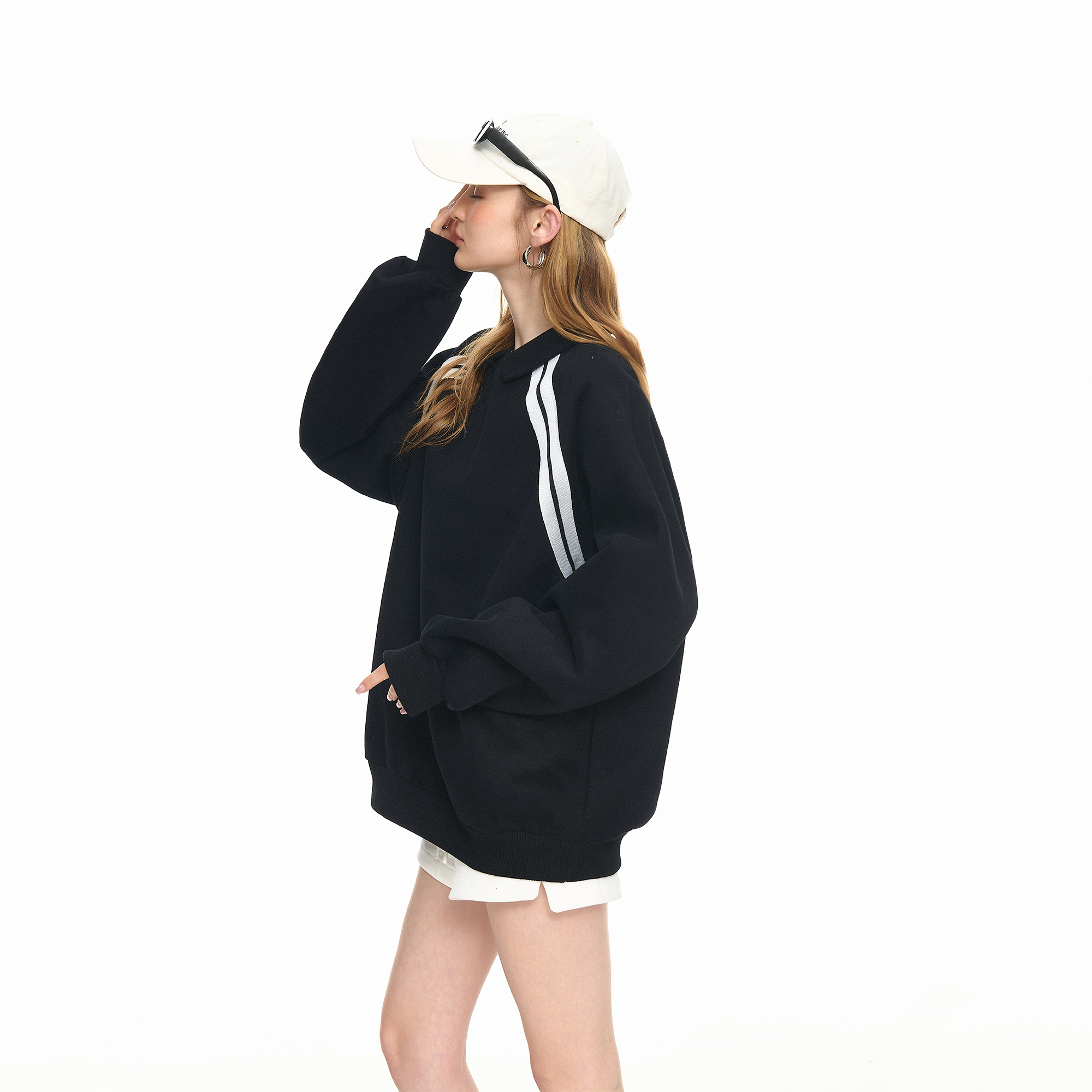 情侣套头上衣 宽松插肩袖 美式 复古条纹撞色翻领卫衣外套女春秋新款