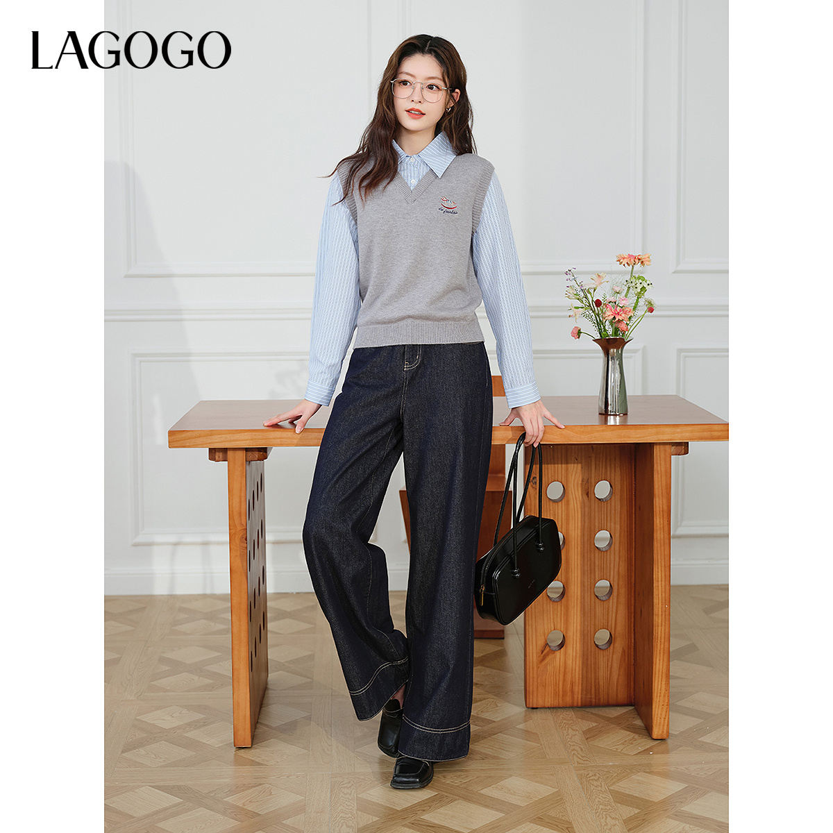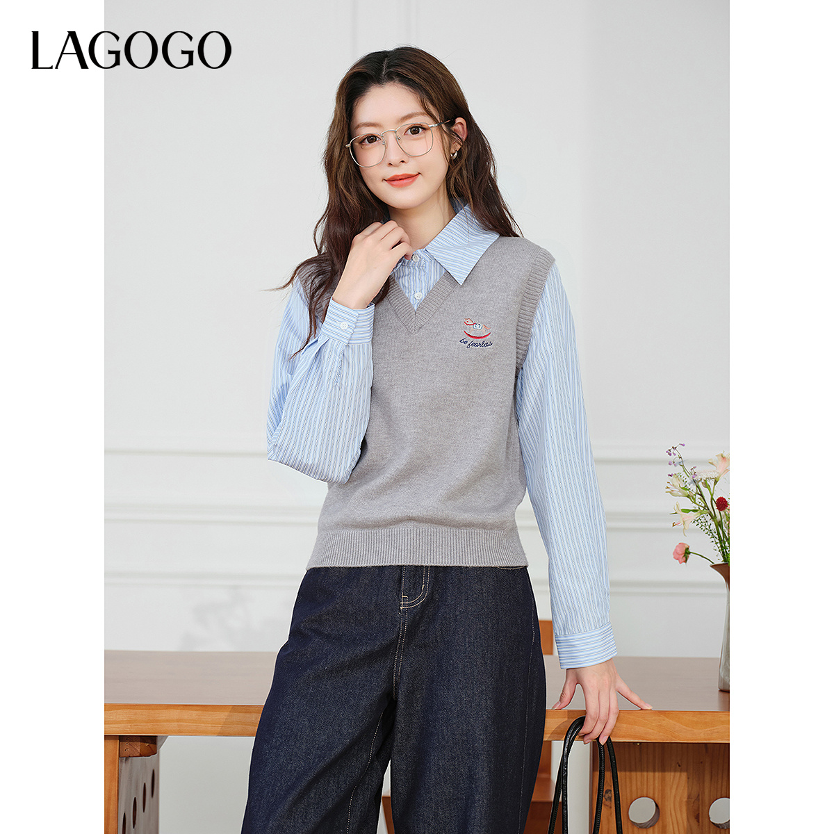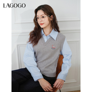 绣花条纹长袖 新款 上 女拉谷谷2025秋冬季 LAGOGO学院风假两件针织衫