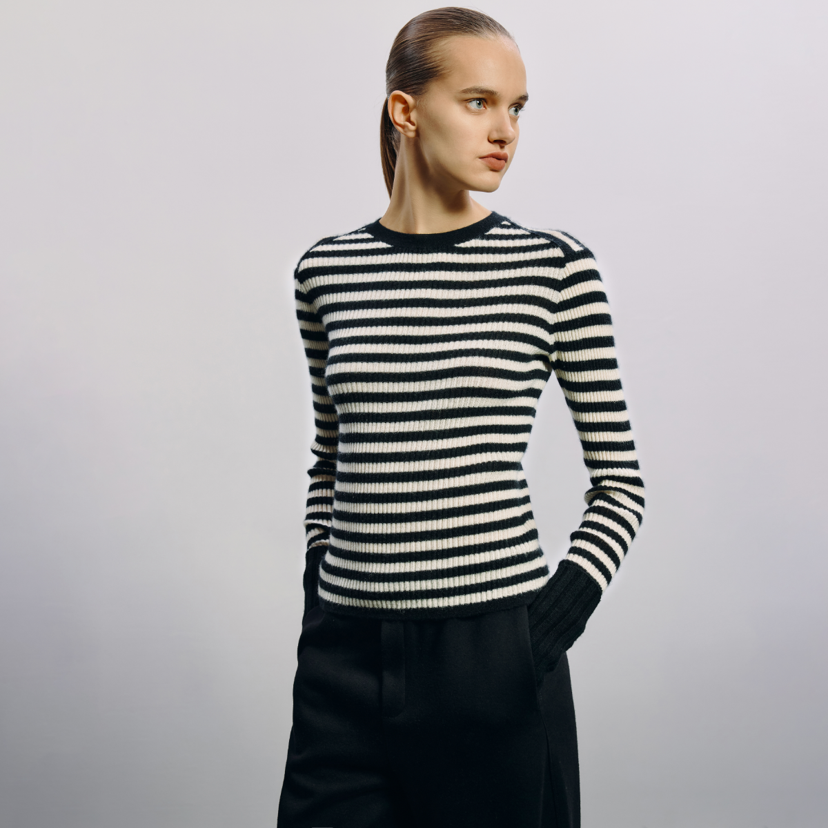 0368 HAVVA拼色条纹圆领毛针织衫 舒适女士内搭套头上衣2025秋季