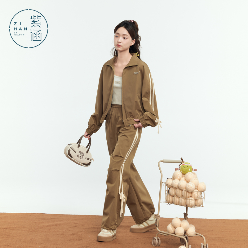 新款 紫涵撞色条纹蝴蝶结拉链外套工装 女秋季 休闲通勤两件套装 长裤