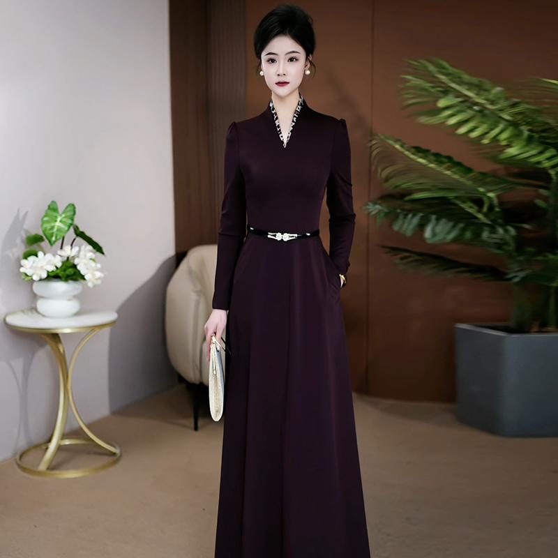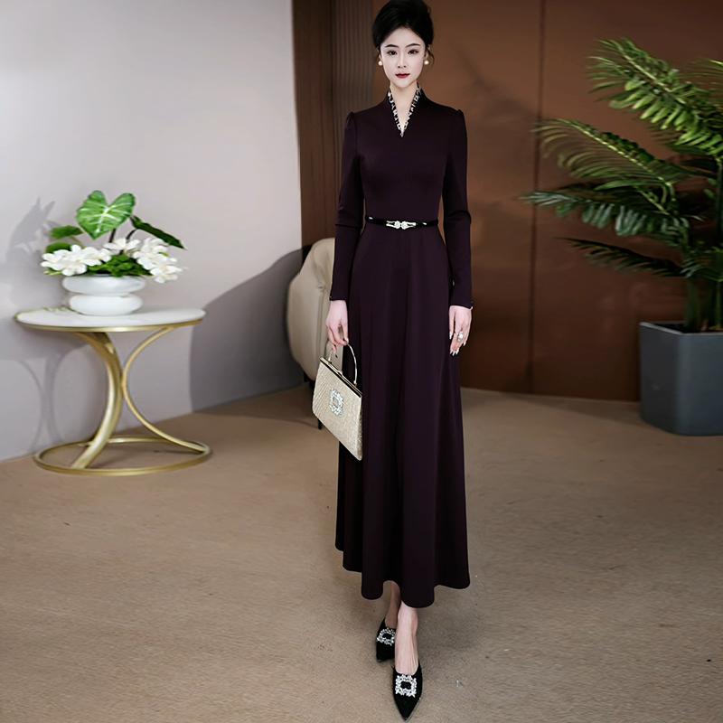 高级感显瘦长袖 新款 气质超长裙011 场合连衣裙女春秋季 深紫色正式