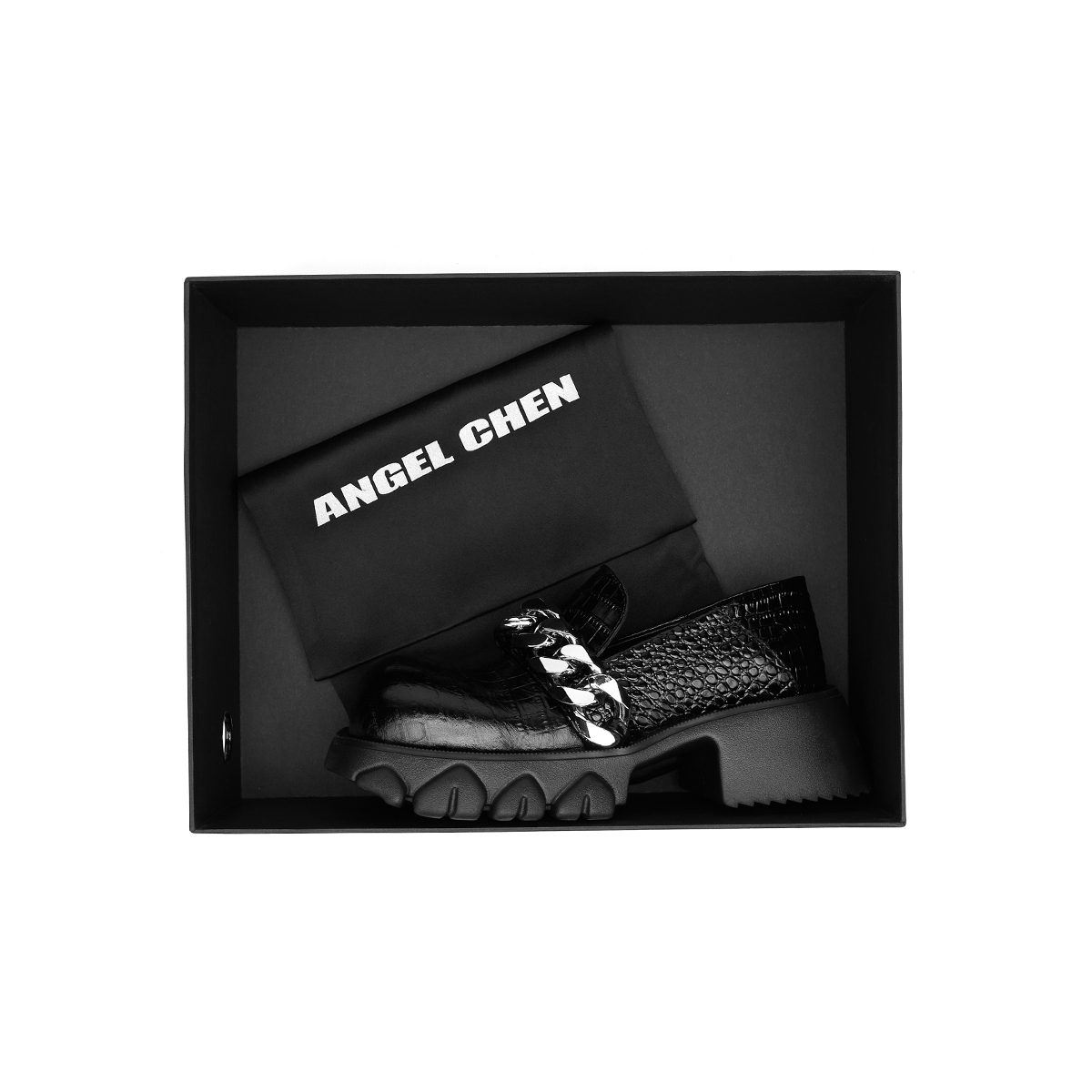 女 陈安琪原创设计黑色鳄鱼纹乐福龙齿鞋 ANGEL CHEN