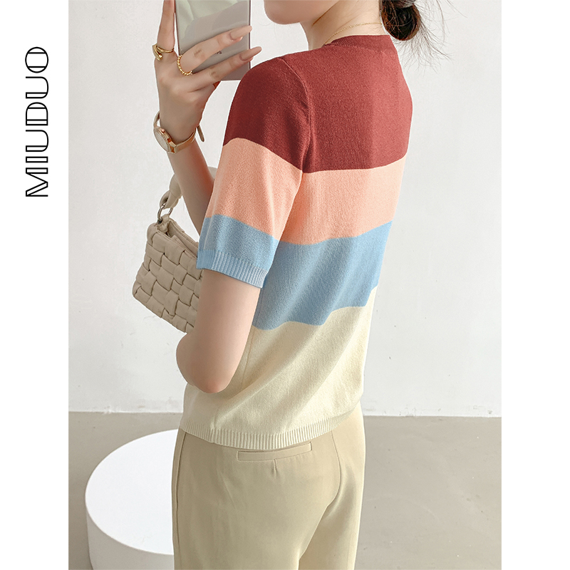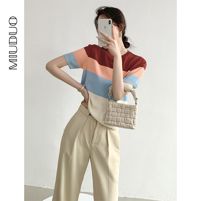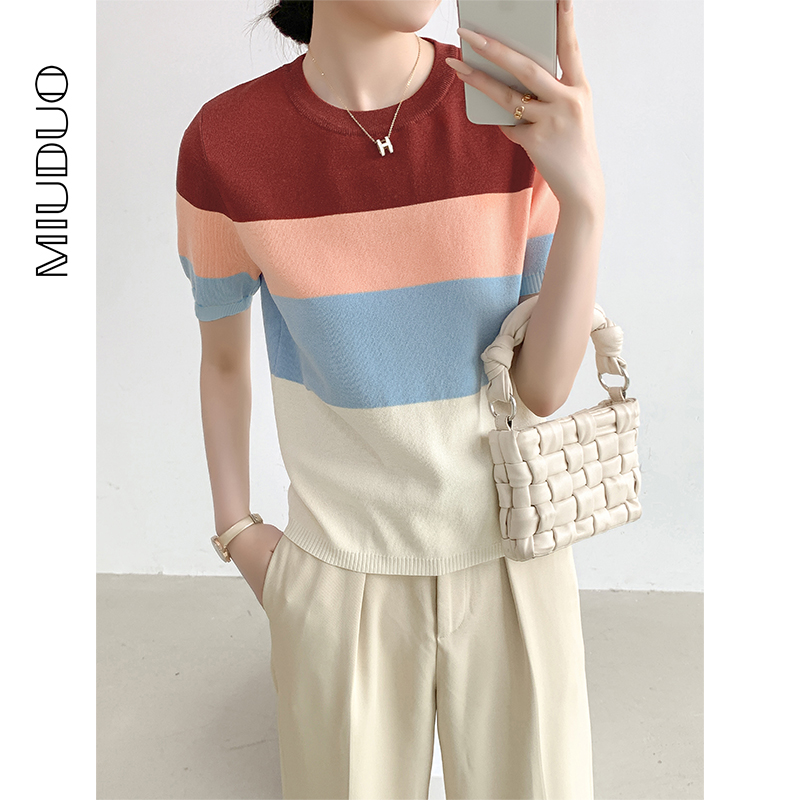 条纹短款 夏针织冰丝短袖 t恤夏季 百搭短袖 女装 原创条纹上衣女夏款