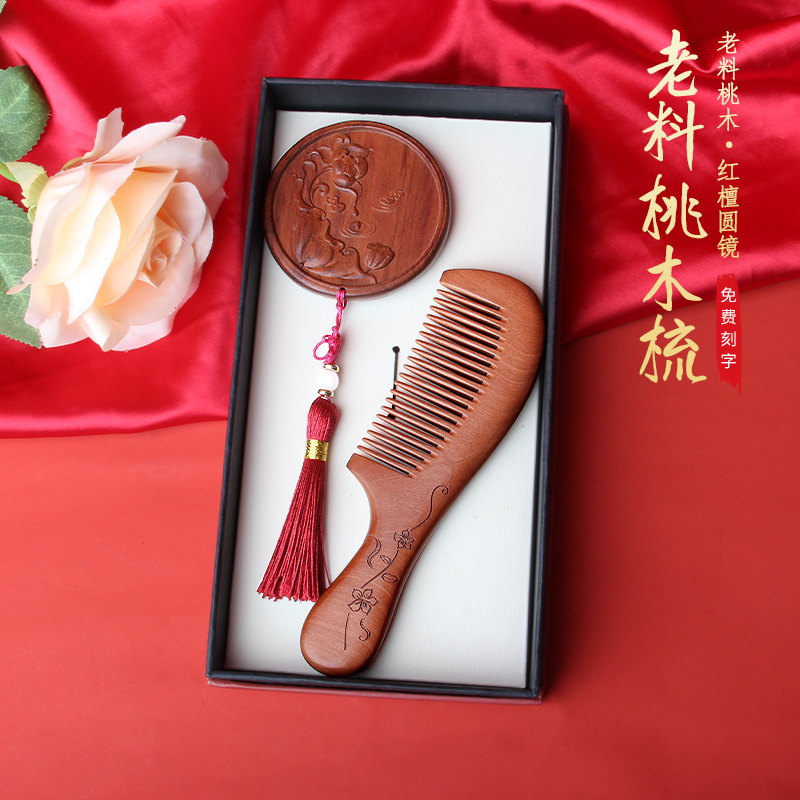 美木兮天然桃木梳子镜子套装 按摩刻字生日礼物梳子 学生整木礼盒装