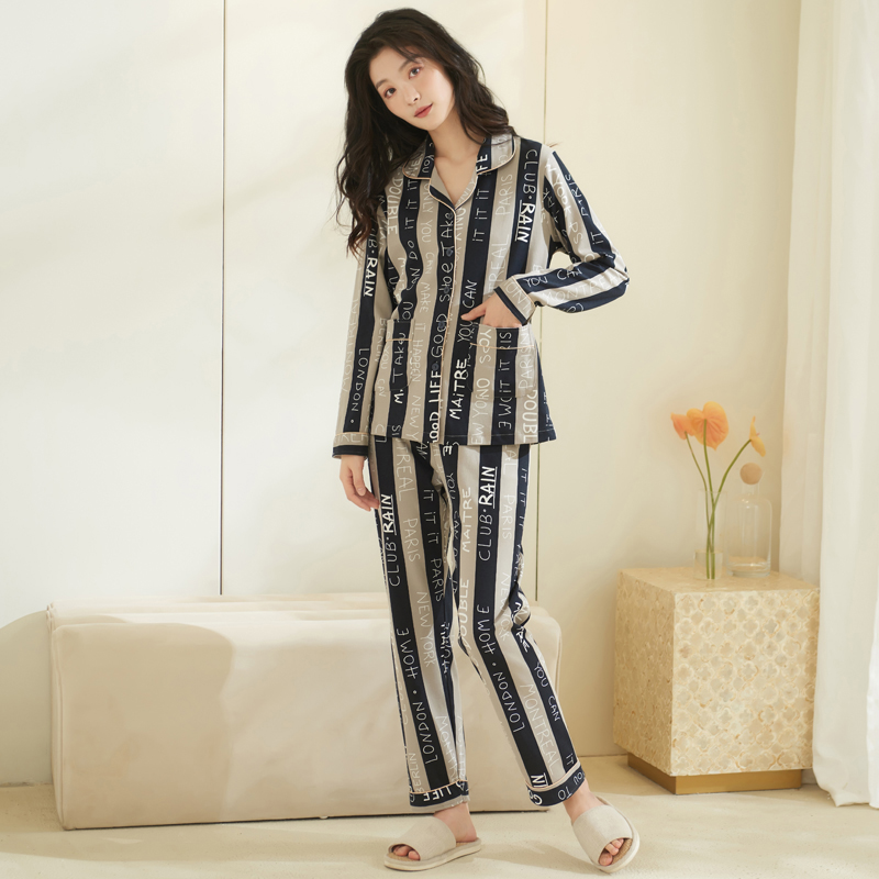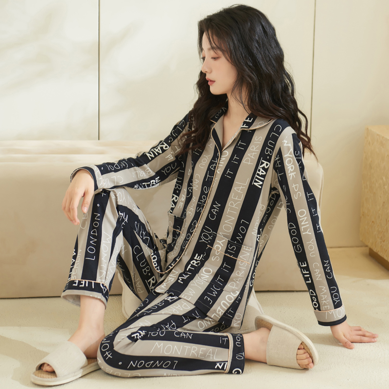 可外穿家居服套装 高级感中老年妈妈大码 纯棉长袖 条纹睡衣女春秋款