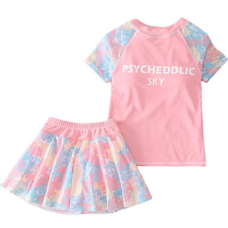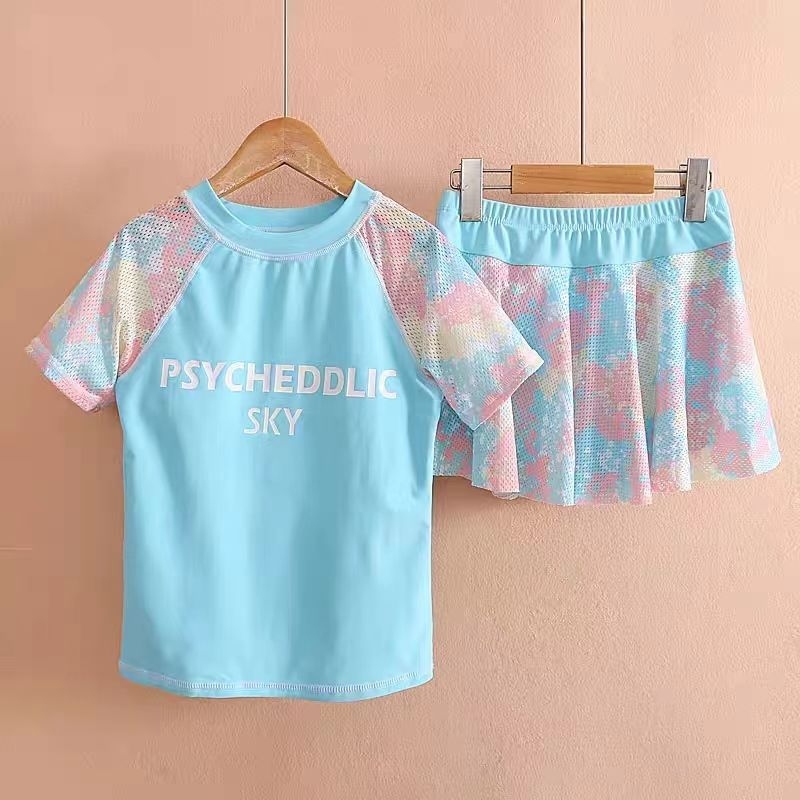 中大童防走光裙子游泳衣速干泳衣女孩 韩版 女童泳衣分体裙式 短袖