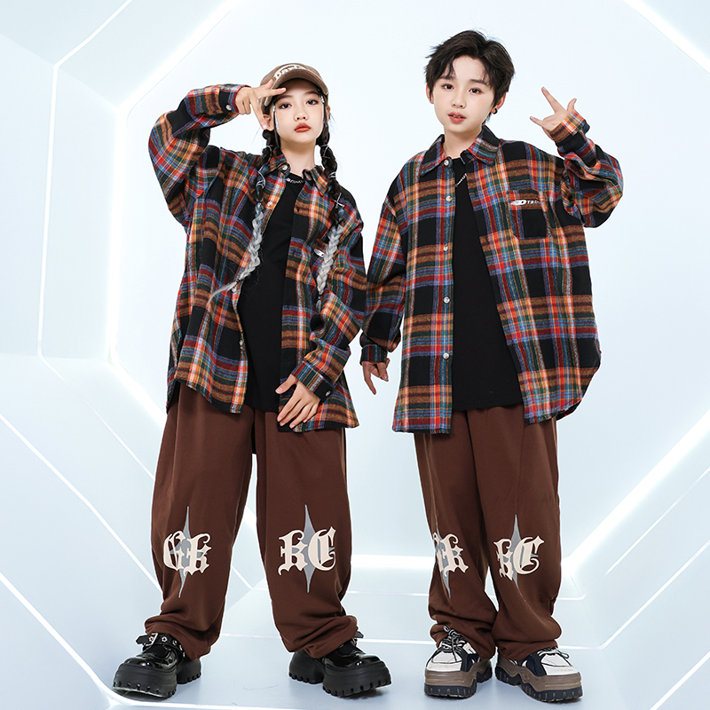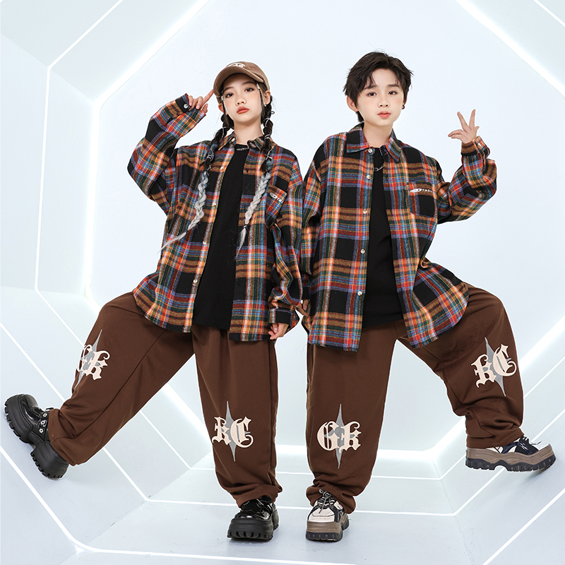 儿童街舞潮服嘻哈风男女童酷帅格子衬衫 hiphop架子鼓爵士舞演出服