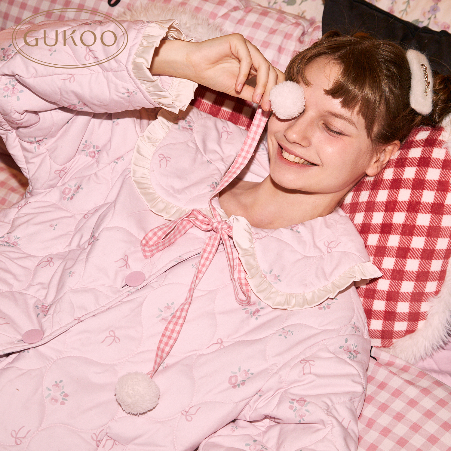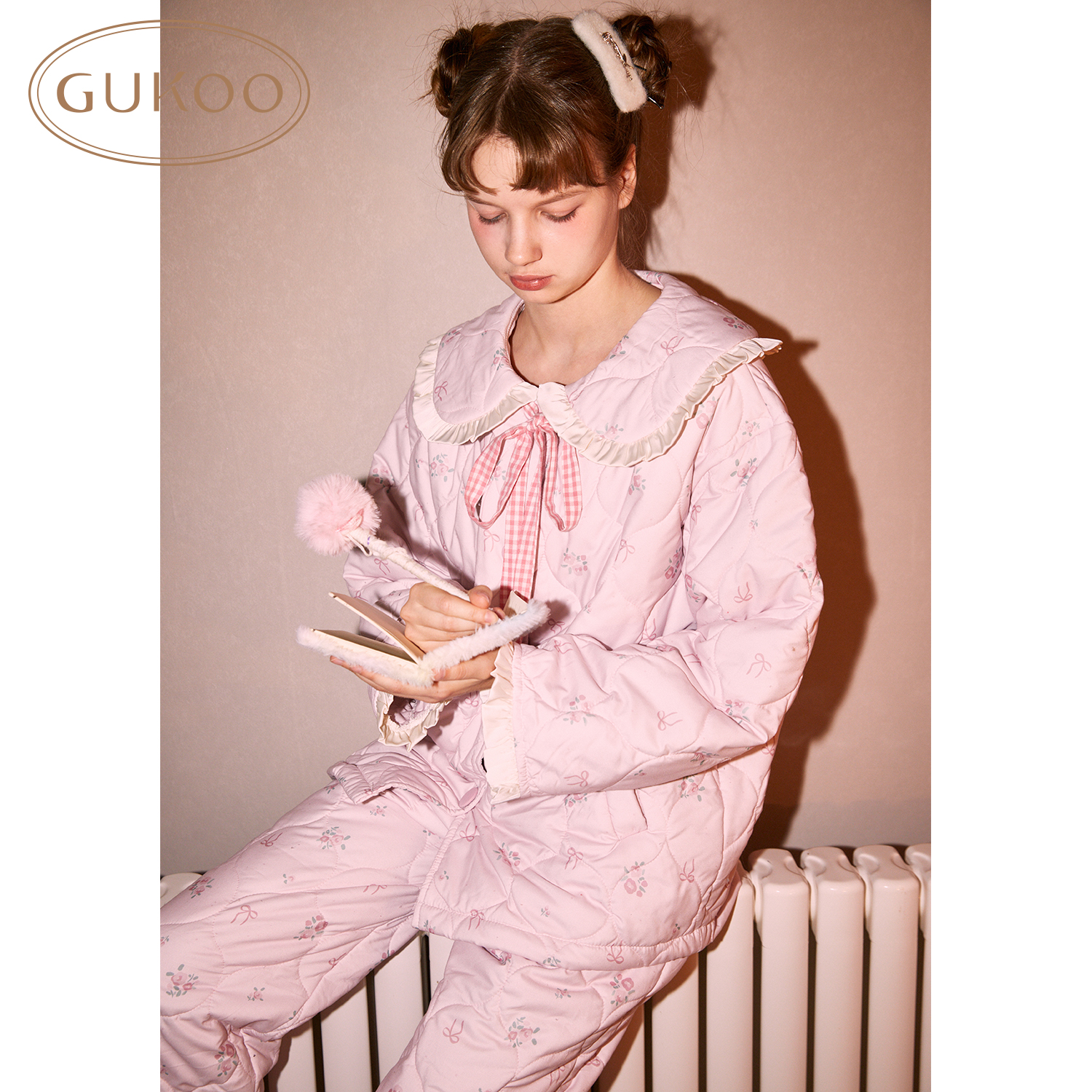 夹棉保暖女士家居服套装 小碎花满印新款 果壳睡衣女冬季 Gukoo