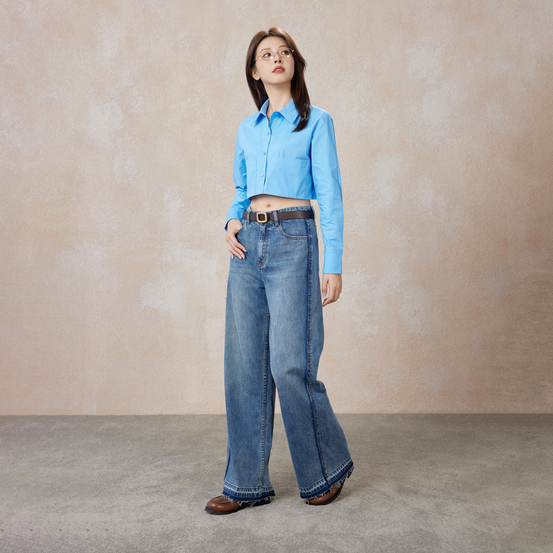 时尚 褶皱裤 脚弯刀裤 三福牛仔裤 子女装 冬季 宽松长裤 510496 2025新款