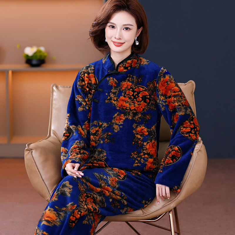 法兰绒秋冬加厚保暖中老年女士睡衣套装 简约甜美珊瑚绒家居服 大码