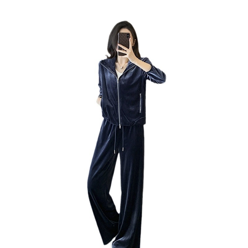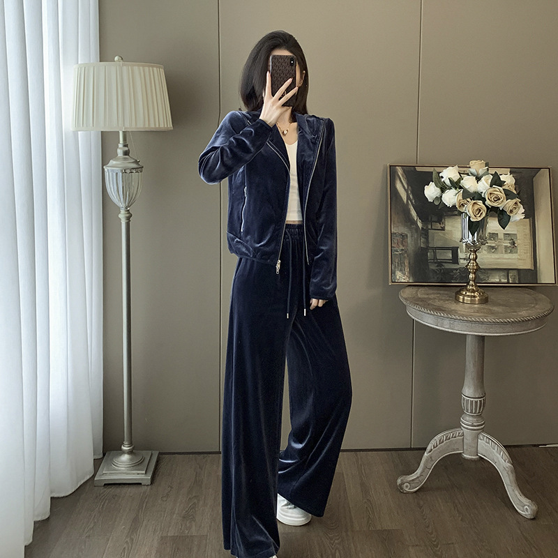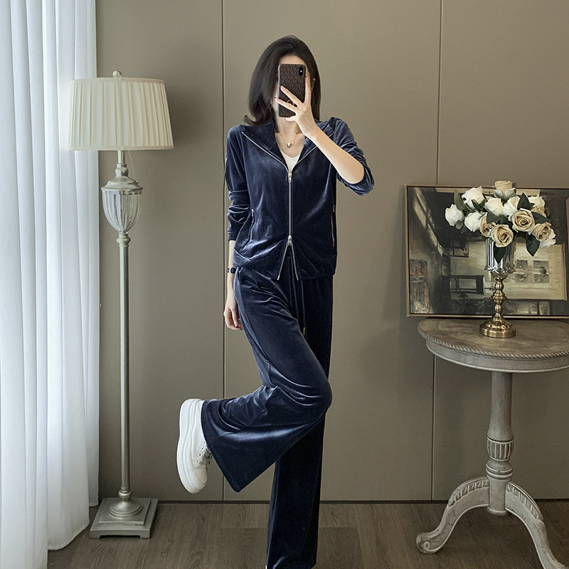 时尚 女今年流行 运动休闲气质连帽两件套 高级感金丝绒套装 新款