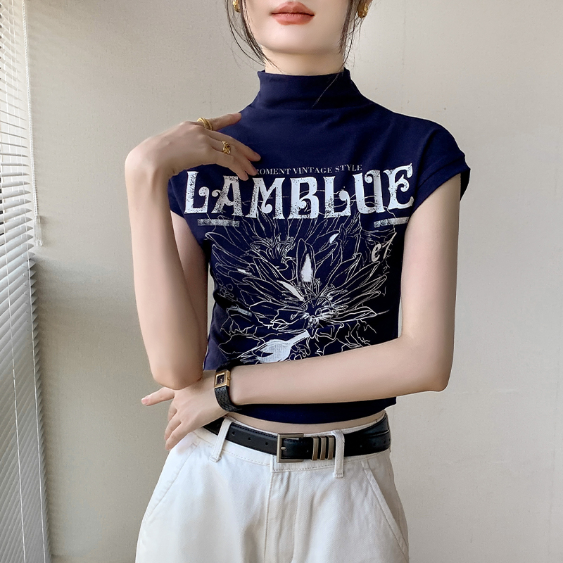 设计感小众坎肩上衣 修身 歌倍尚半高领印花无袖 t恤女2025早秋新款