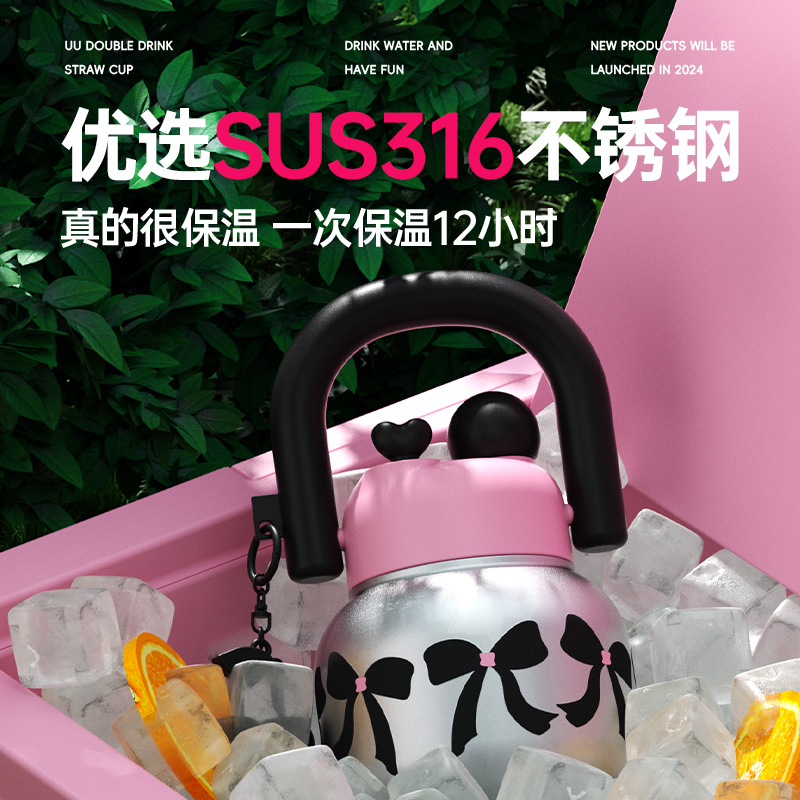 世大家保温杯女2025新款 高颜值儿童水杯带吸管学生便携不锈钢水壶