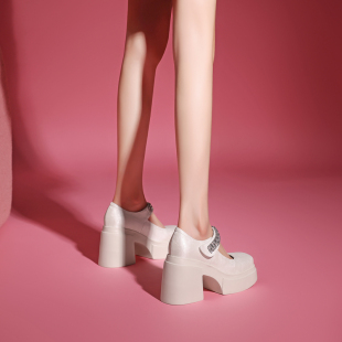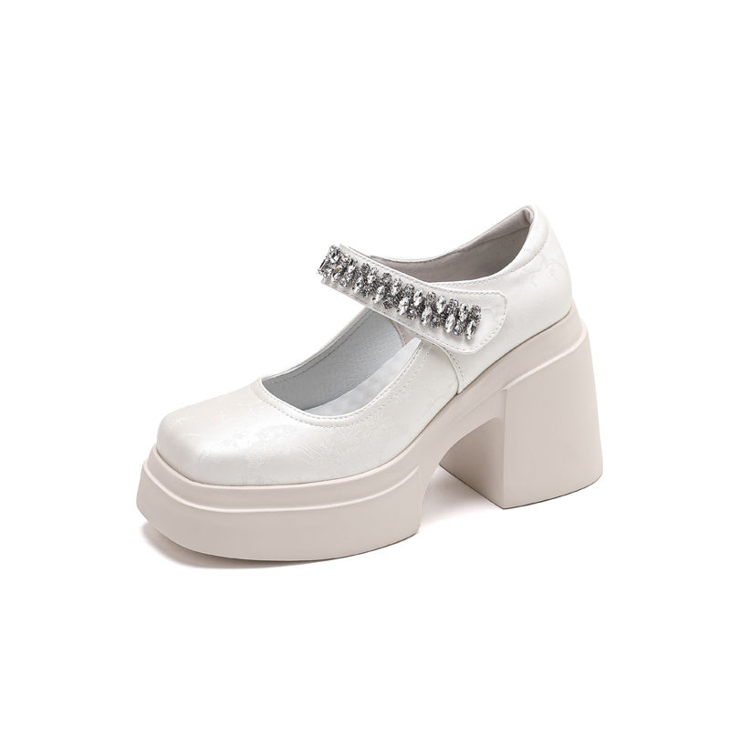 女粗跟鞋 防水台松糕单鞋 10cm厚底粉色方头新中式 水钻玛丽珍高跟鞋