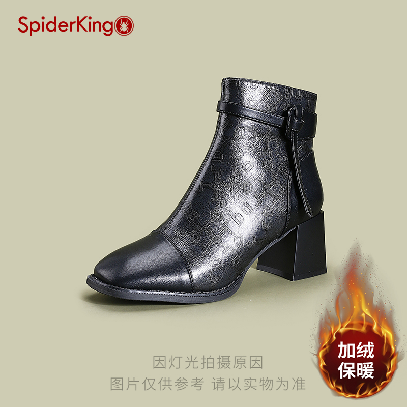 气质马丁靴粗跟高跟鞋 加绒女式 短靴2024冬季 蜘蛛王方头设计感时尚