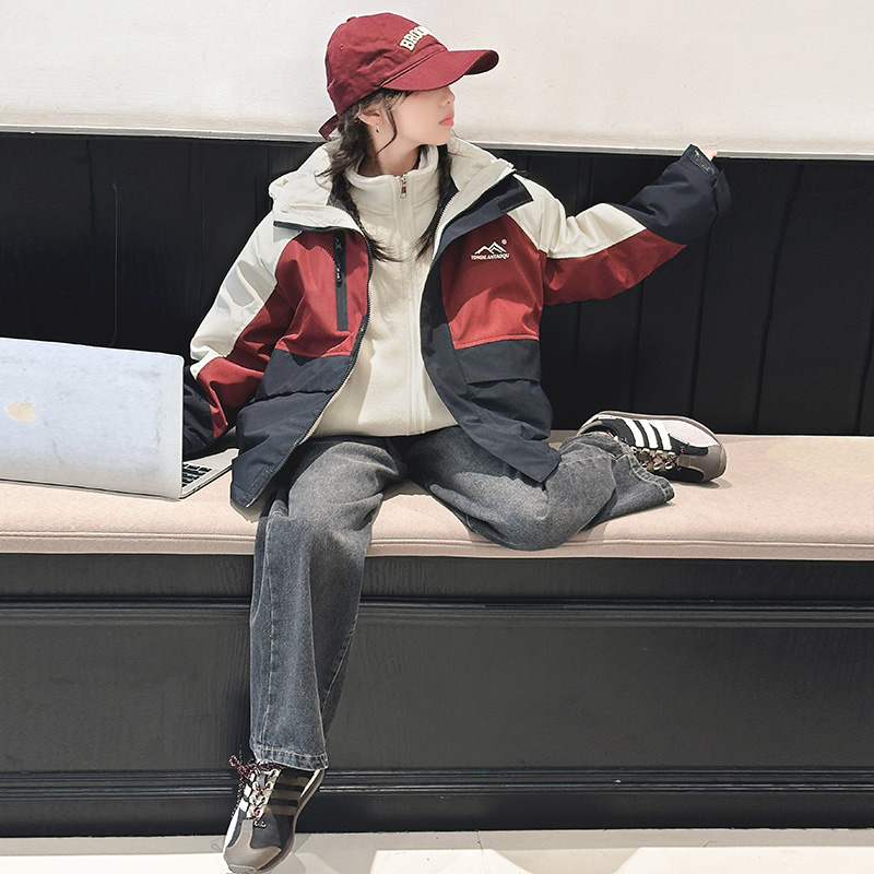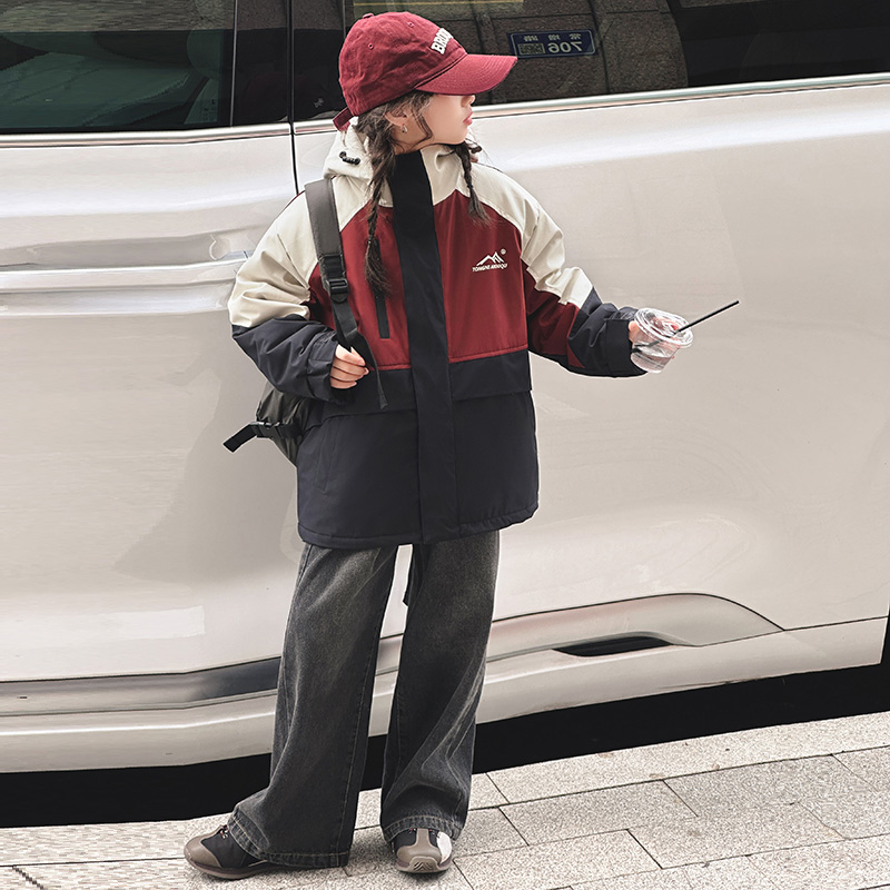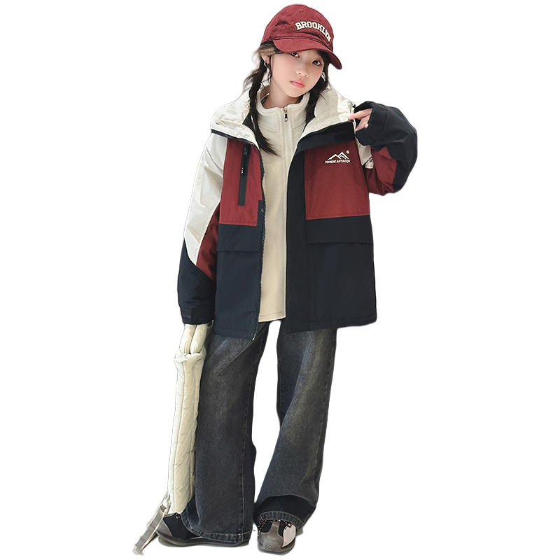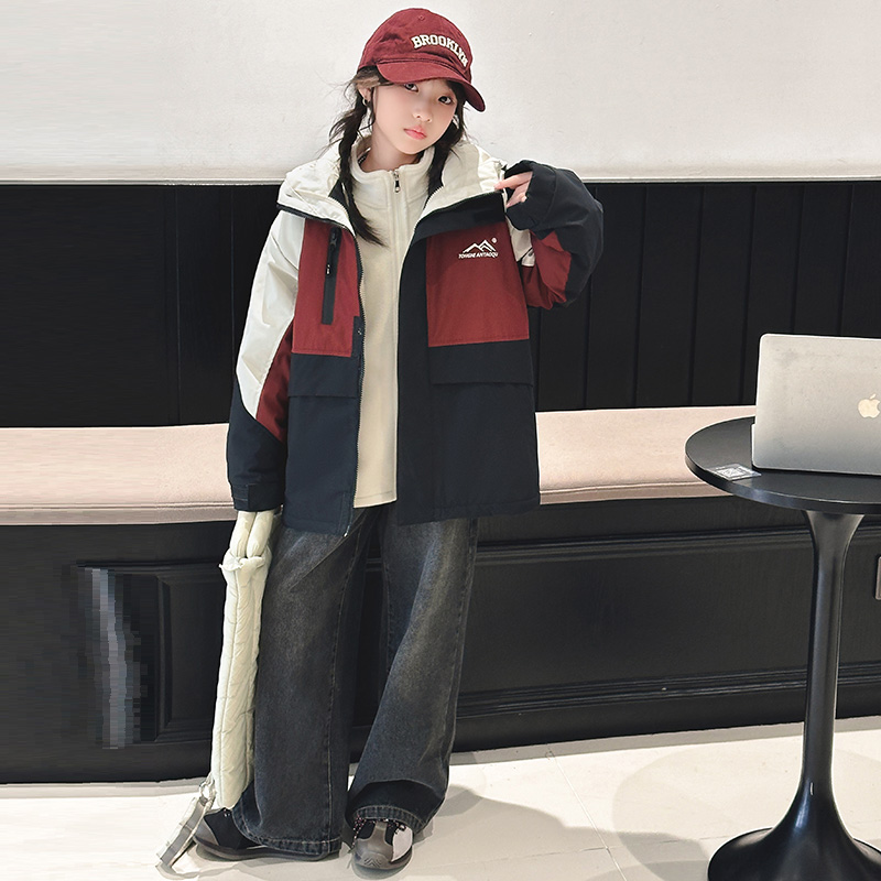 时髦连帽上衣搭配加绒牛仔裤 女童冲锋衣外套秋冬2025新款 儿童秋季