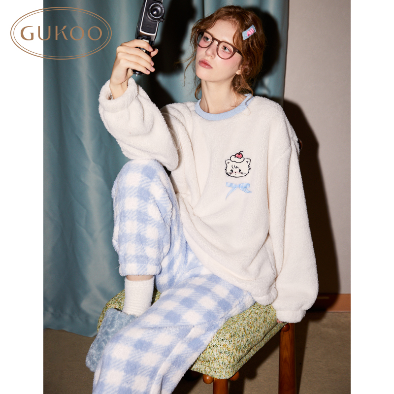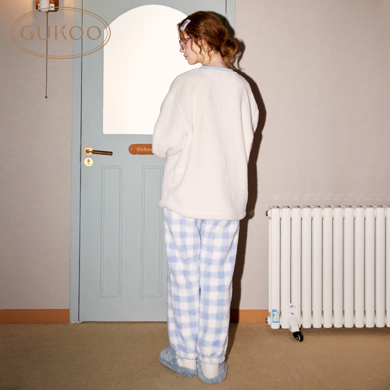 半边绒睡衣女秋冬保暖可爱卡通家居服套装 Gukoo 果壳新款