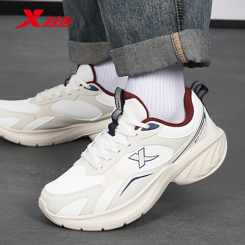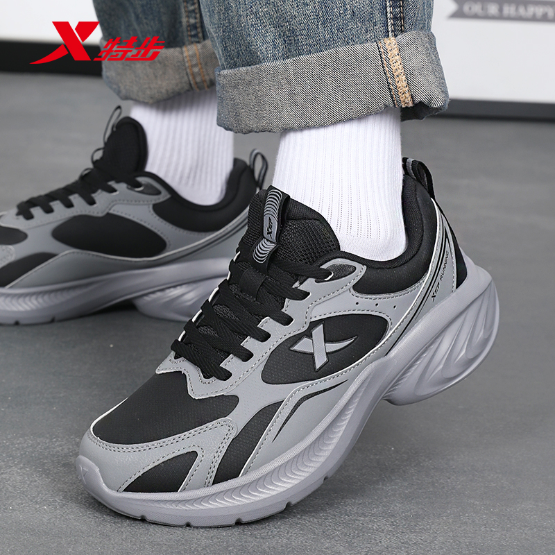 2025新款 皮面防水黑色休闲运动鞋 秋季 男士 轻便减震跑步鞋 特步男鞋