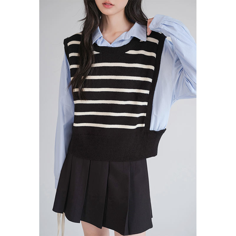 学院风显瘦长袖 蓝若水大码 胖mm秋装 假两件条纹针织衬衫 上衣 女装