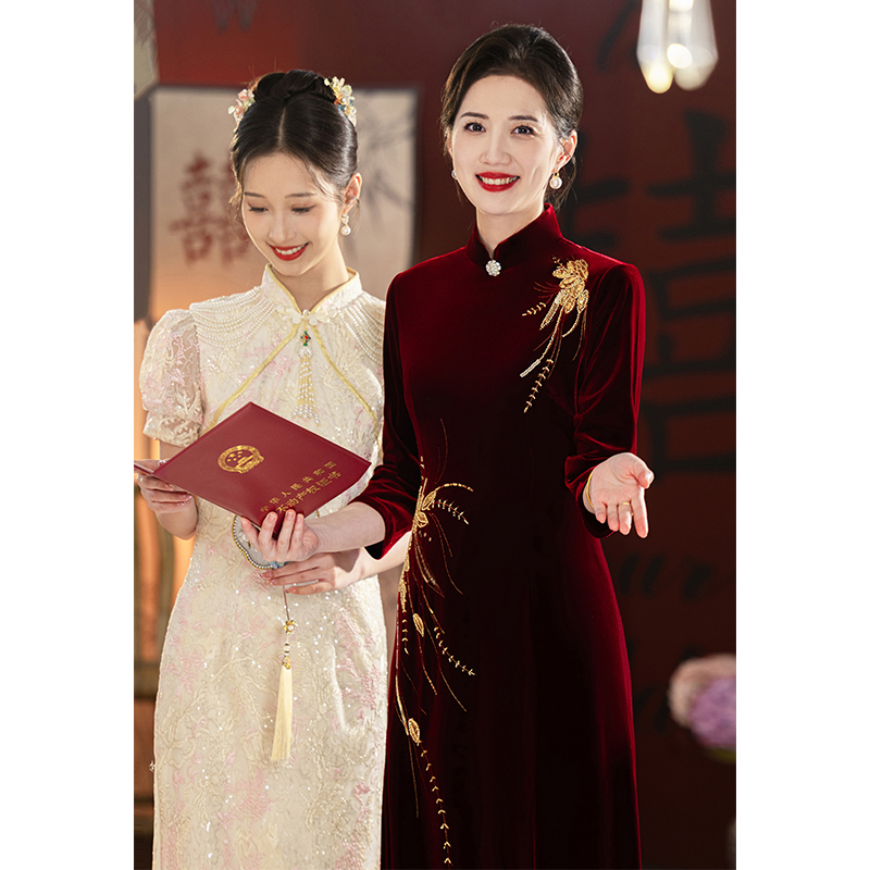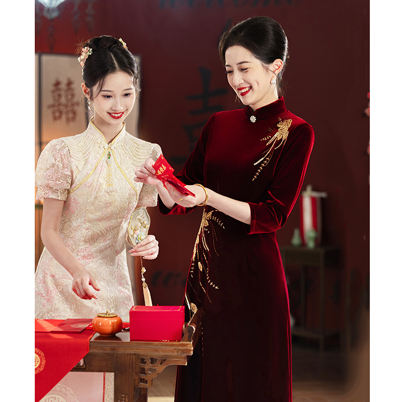 婚礼婆婆旗袍复古长款 旗袍 酒红色醋酸缎提花传统婚礼妈妈婚宴秋季