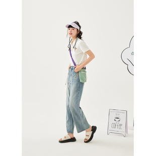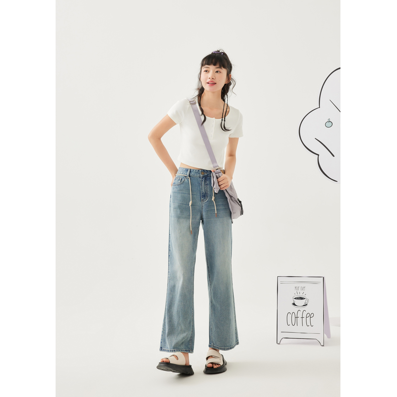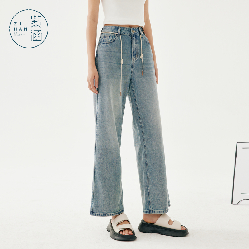 女夏季 宽松百搭休闲裤 新款 时尚 复古水洗阔腿裤 紫涵高腰直筒牛仔裤
